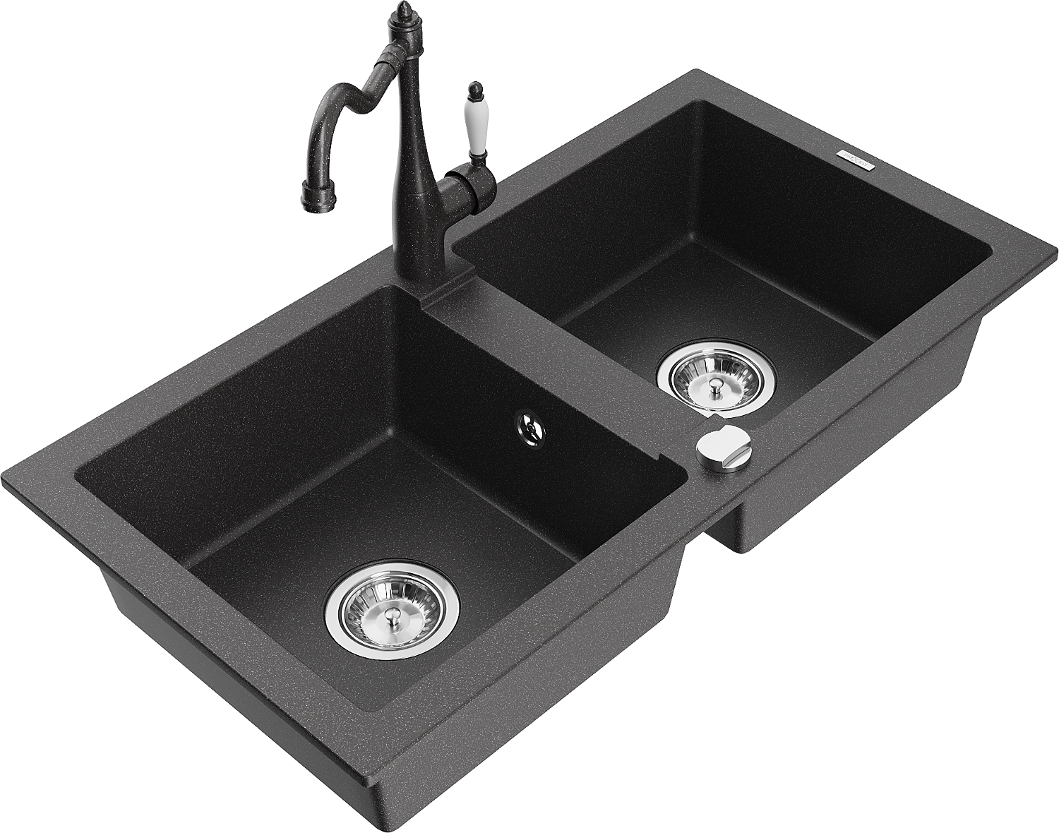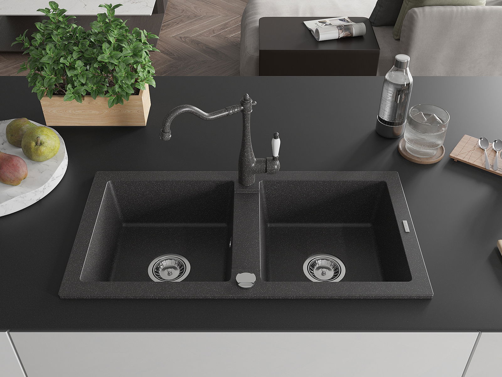 Mexen Mario granitinė kriauklė dviejų skyrių su virtuviniu maišytuvu Carla, juodas taškuotas - 6504-76-670700-76