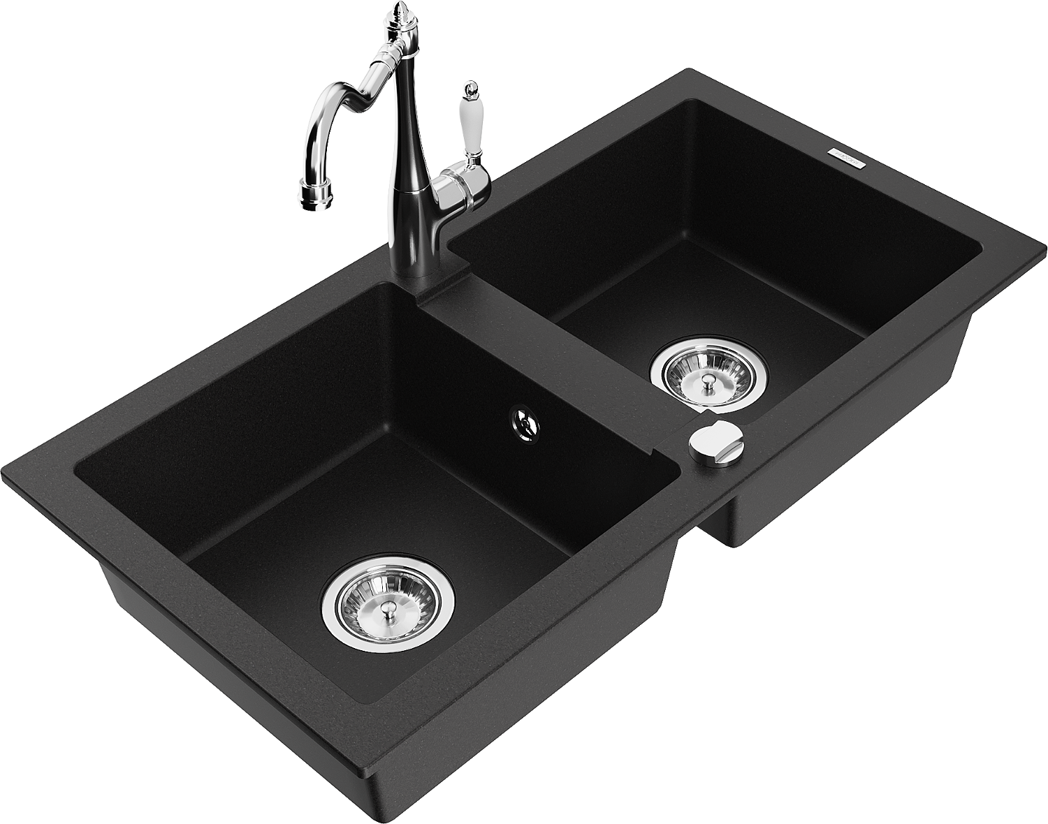 Mexen Mario granitinis dviejų skyrių virtuvės kriauklė su Carlai virtuvės maišytuvu, juoda - 6504-77-670700-00