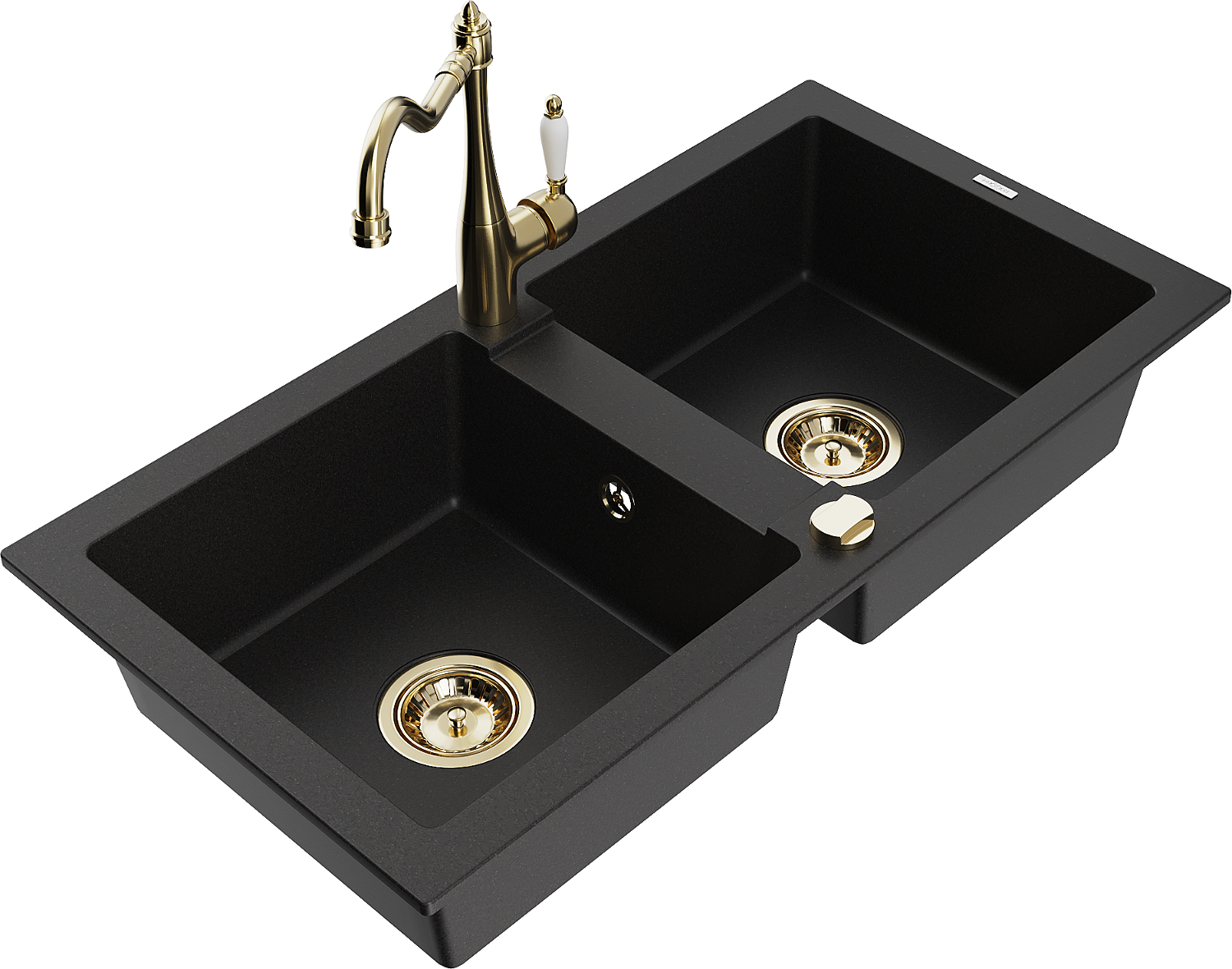 Mexen Mario granitinis dviejų skyrių kriauklė su virtuviniu maišytuvu Carla, juodas - 6504-77-670700-50