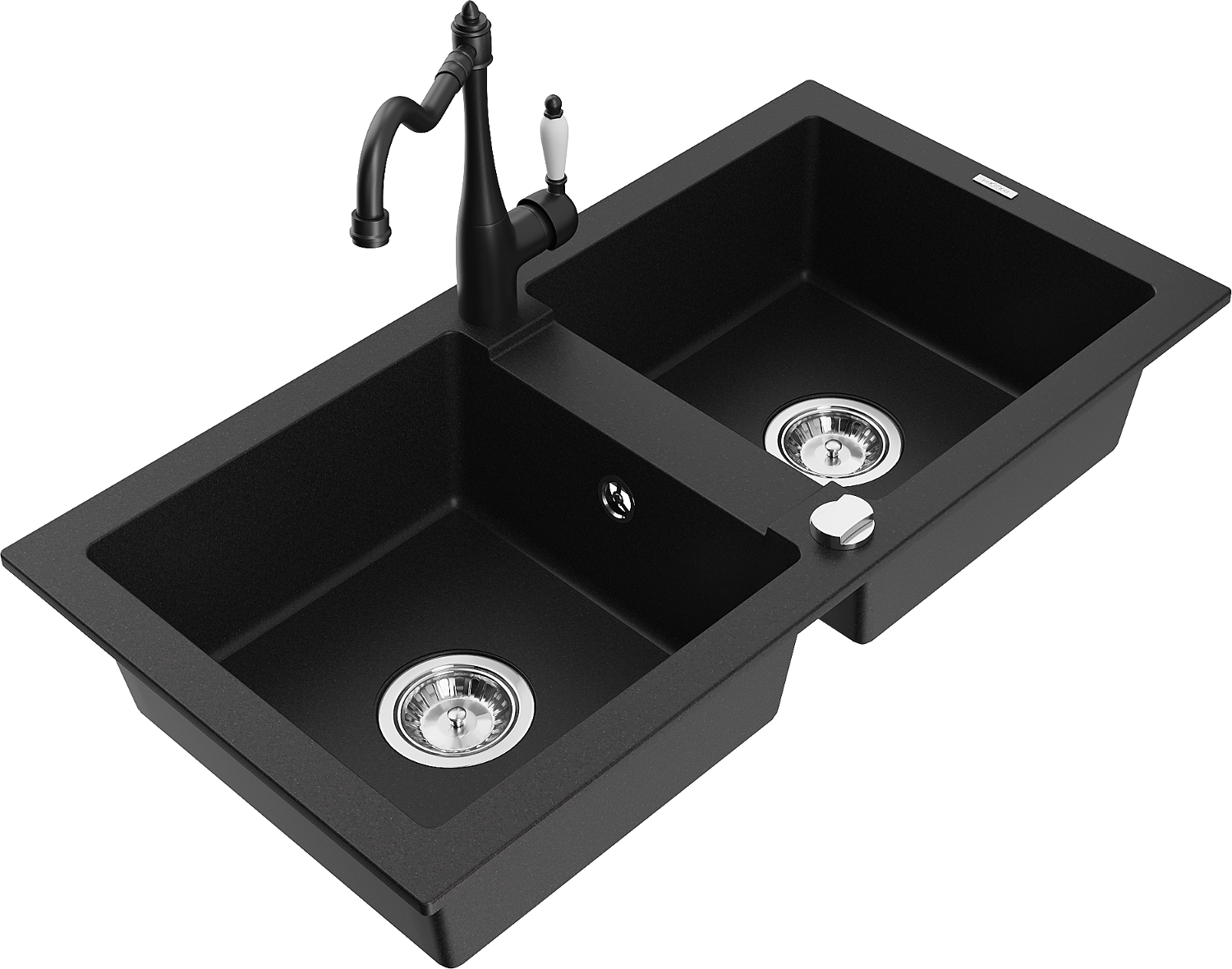 Mexen Mario granitinė dviejų kamerų plautuvė su virtuviniu čiaupu Carla, juodas - 6504-77-670700-70