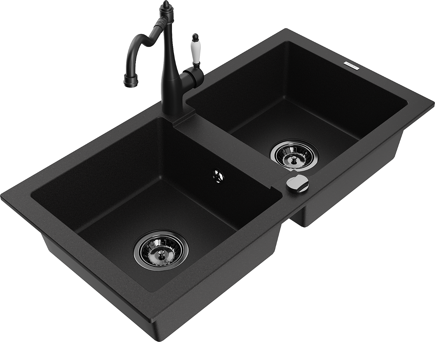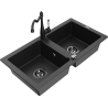Mexen Mario granito kriauklė, 2-jų dalių, su virtuviniu maišytuvu Carla, juoda - 6504-77-670700-70-B