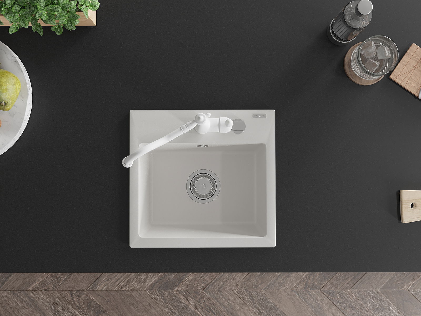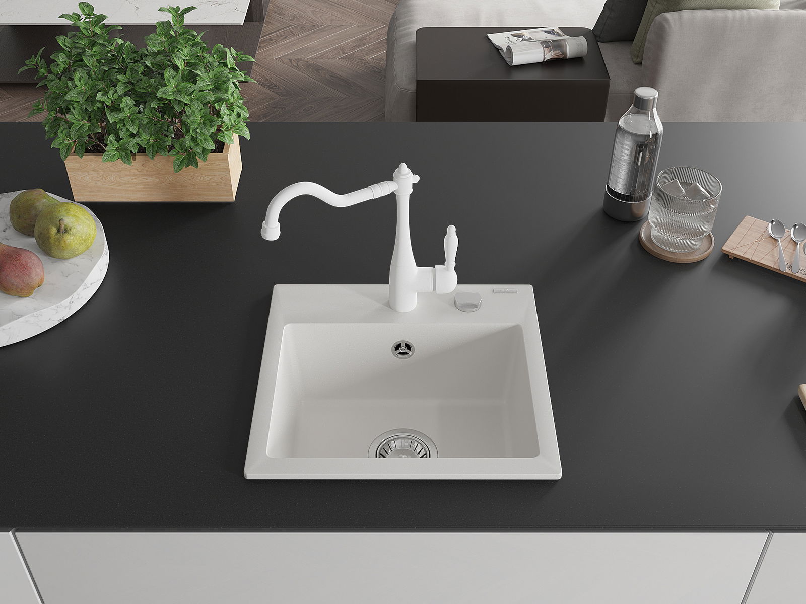 Mexen Milo 1 kojelės granitinis kriauklė su virtuviniu maišytuvu Carla, baltas - 6505-20-670700-20