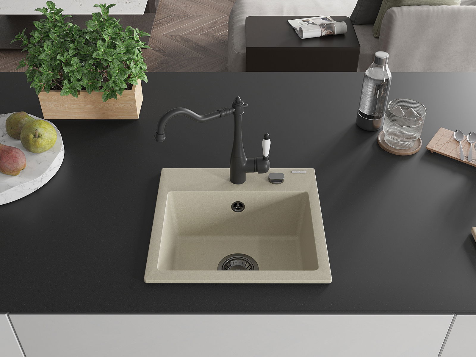 Mexen Milo vienos kameros granitinė plautuvė su virtuviniu maišytuvu Carla, smėlinė - 6505-69-670700-70