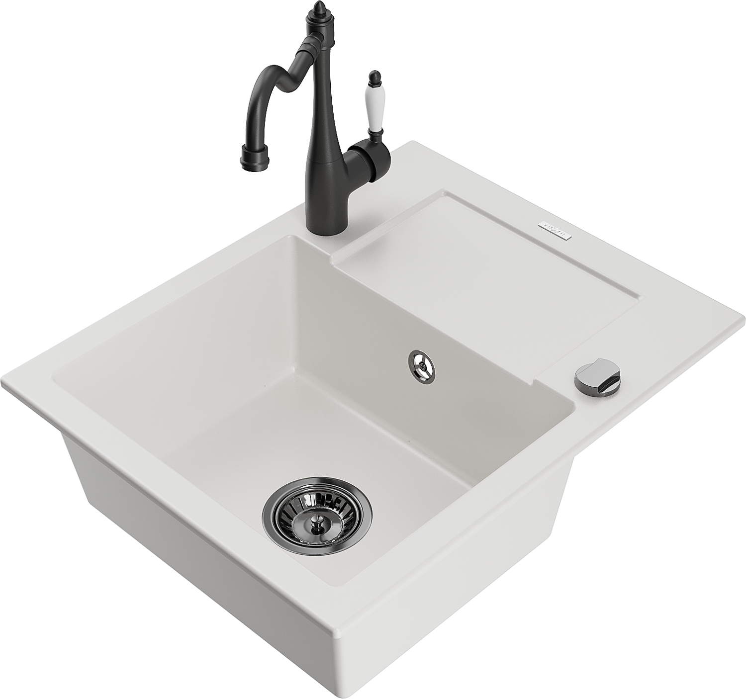Mexen Enzo granito kriauklė su viena plautuve, nusausintuvu ir virtuvės maišytuvu Carla, balta - 6506-20-670700-70