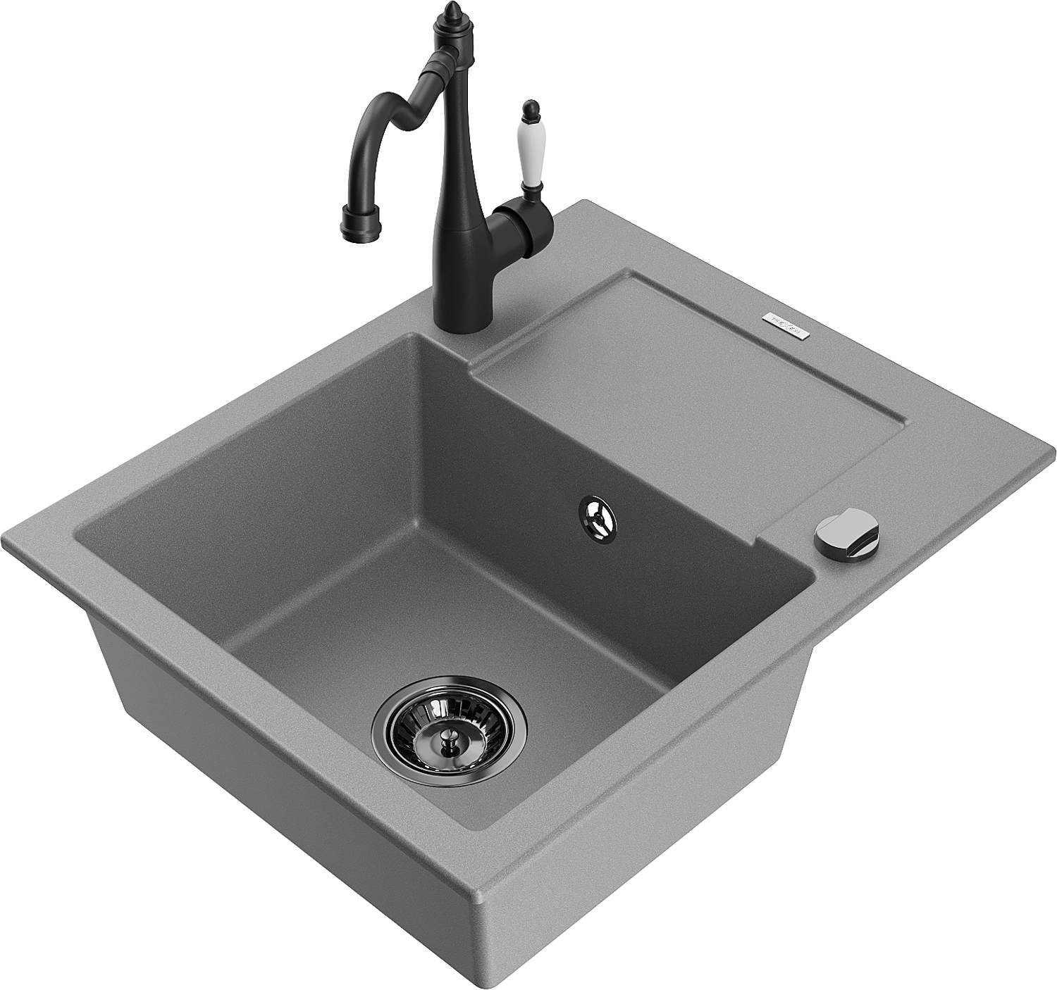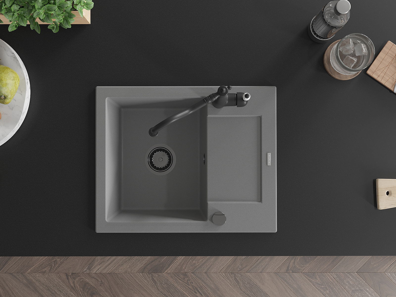 Mexen Enzo vienos kamaros granito plautuvė su nuvarvėjimu ir virtuviniu maišytuvu Carla, pilka - 6506-71-670700-70-B