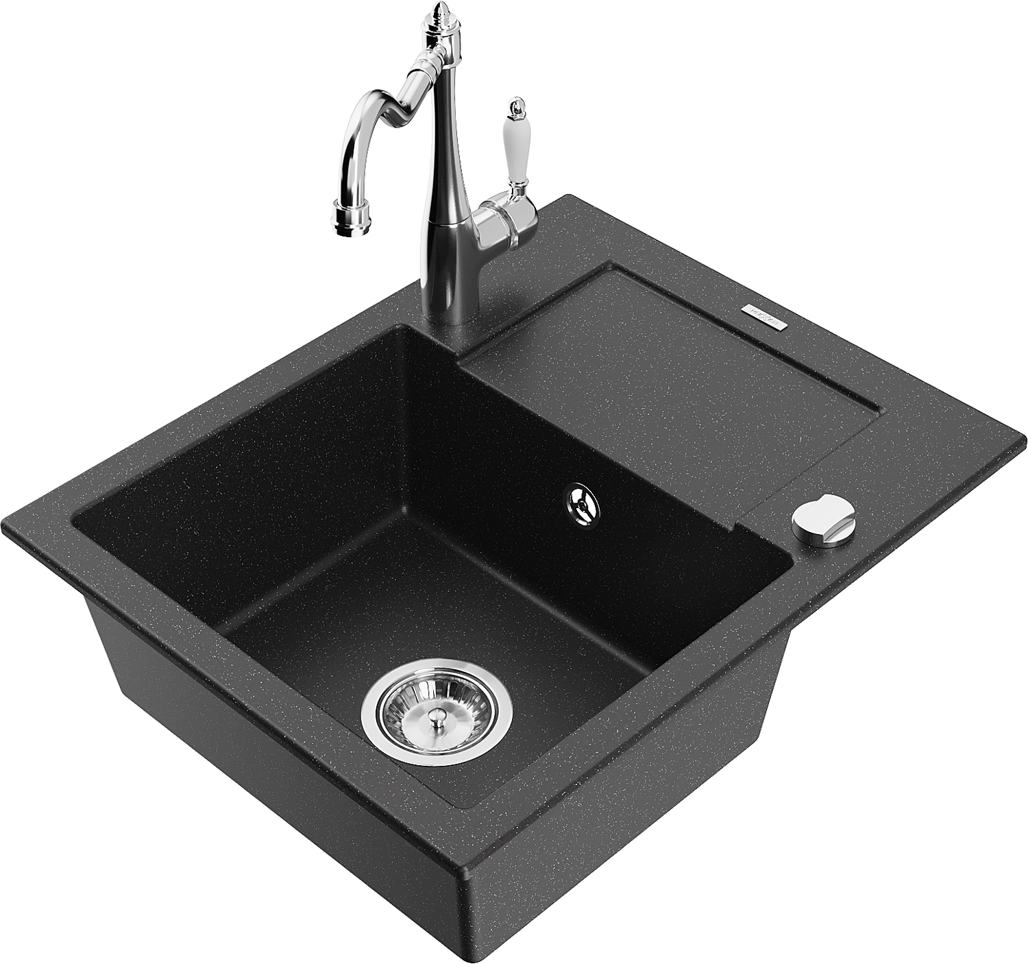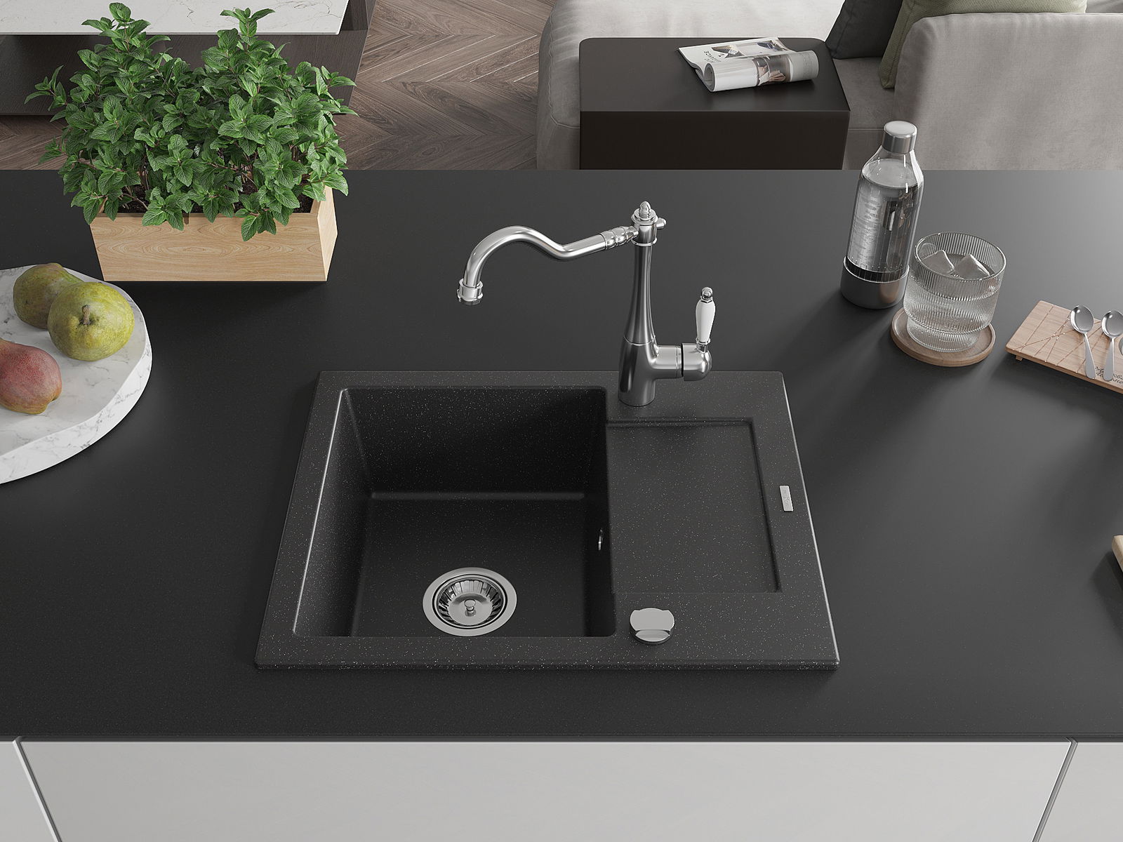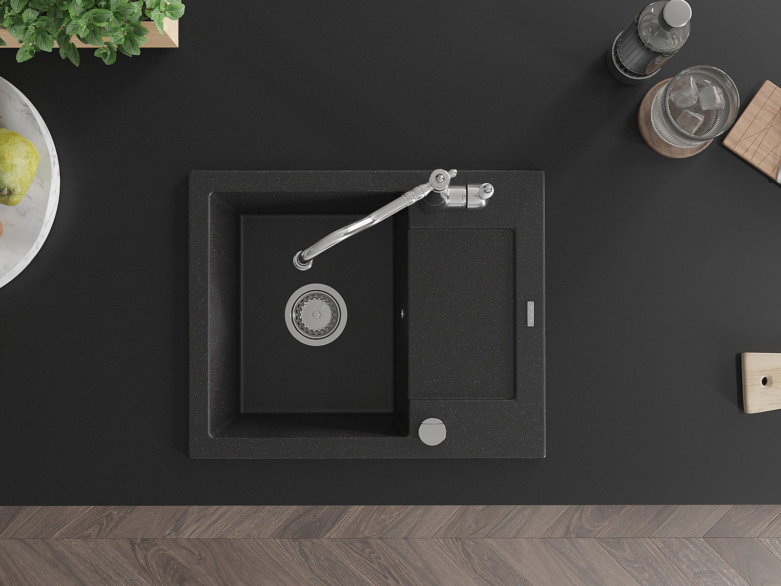 Mexen Enzo granitinė vienos dubens plautuvė su išvarža ir virtuvės maišytuvu Carla, juoda/sidabrinio metalo
