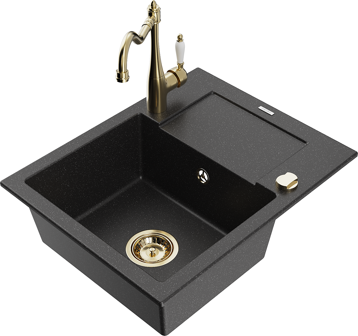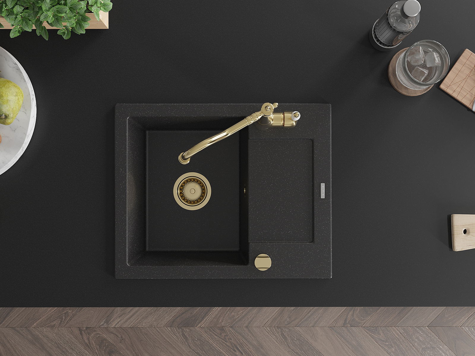 Mexen Enzo granitinė vienos kameros plautuvė su nutekėjimu ir virtuviniu maišytuvu Carla, juoda/sidabrinė metalika