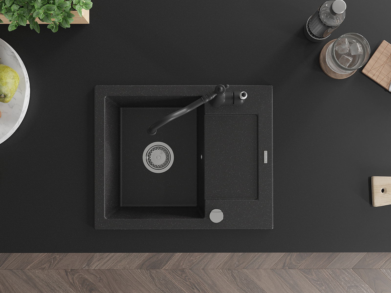 Mexen Enzo vienos kameros granitinė plautuvė su lašėjimo paviršiumi ir virtuviniu maišytuvu Carla, juoda/sidabrinis metalikas -?