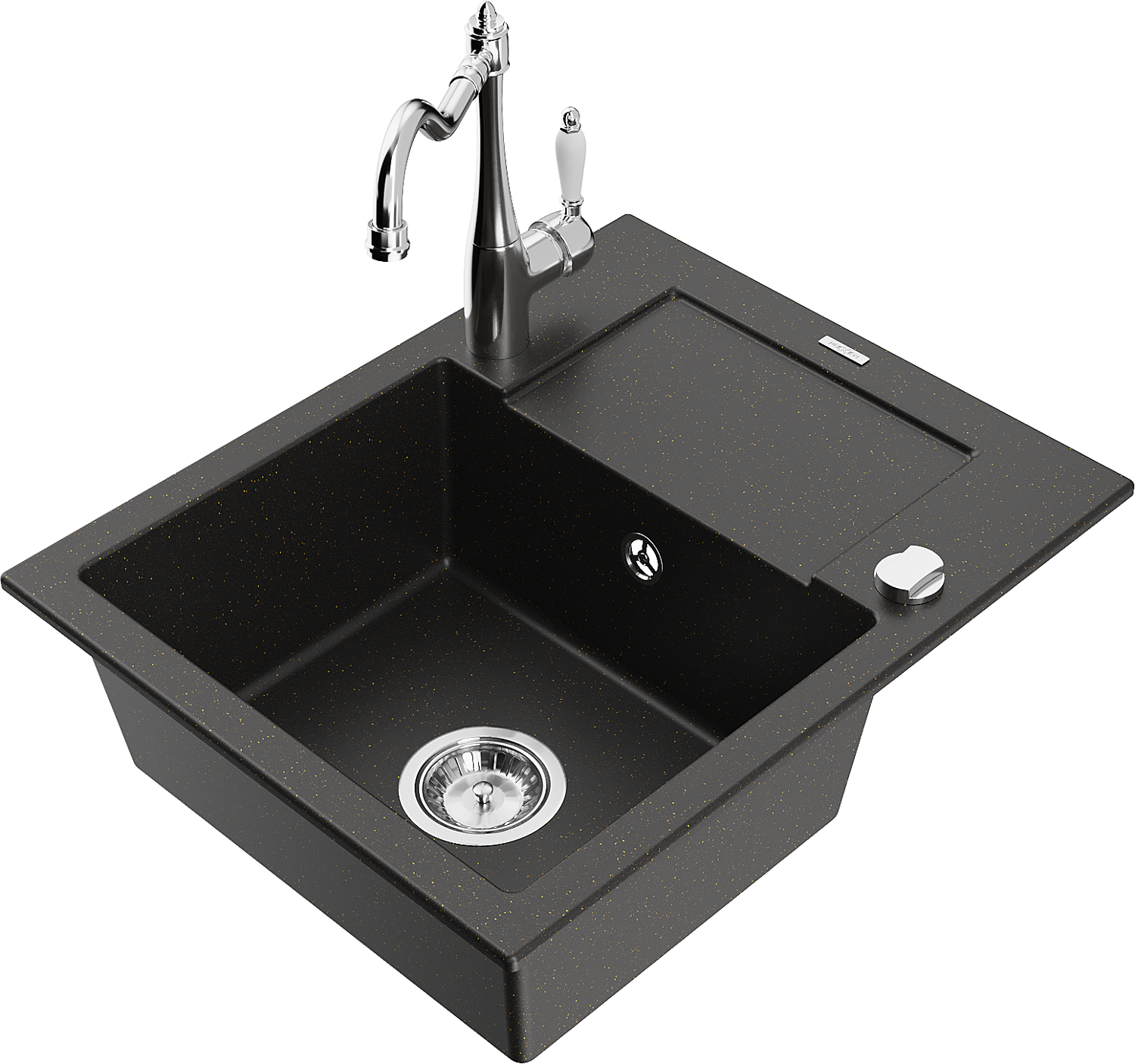 Mexen Enzo granitinė vienos kameros plautuvė su nutekėjimu ir virtuviniu maišytuvu Carla, juoda/auksinė metalo spalva