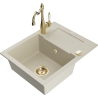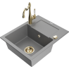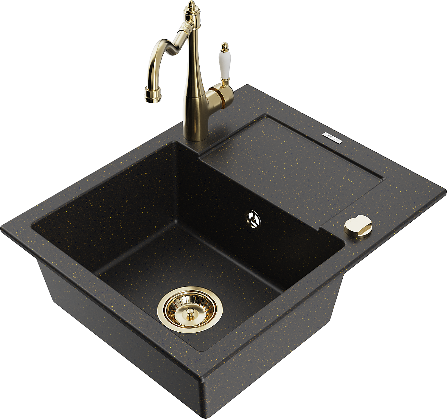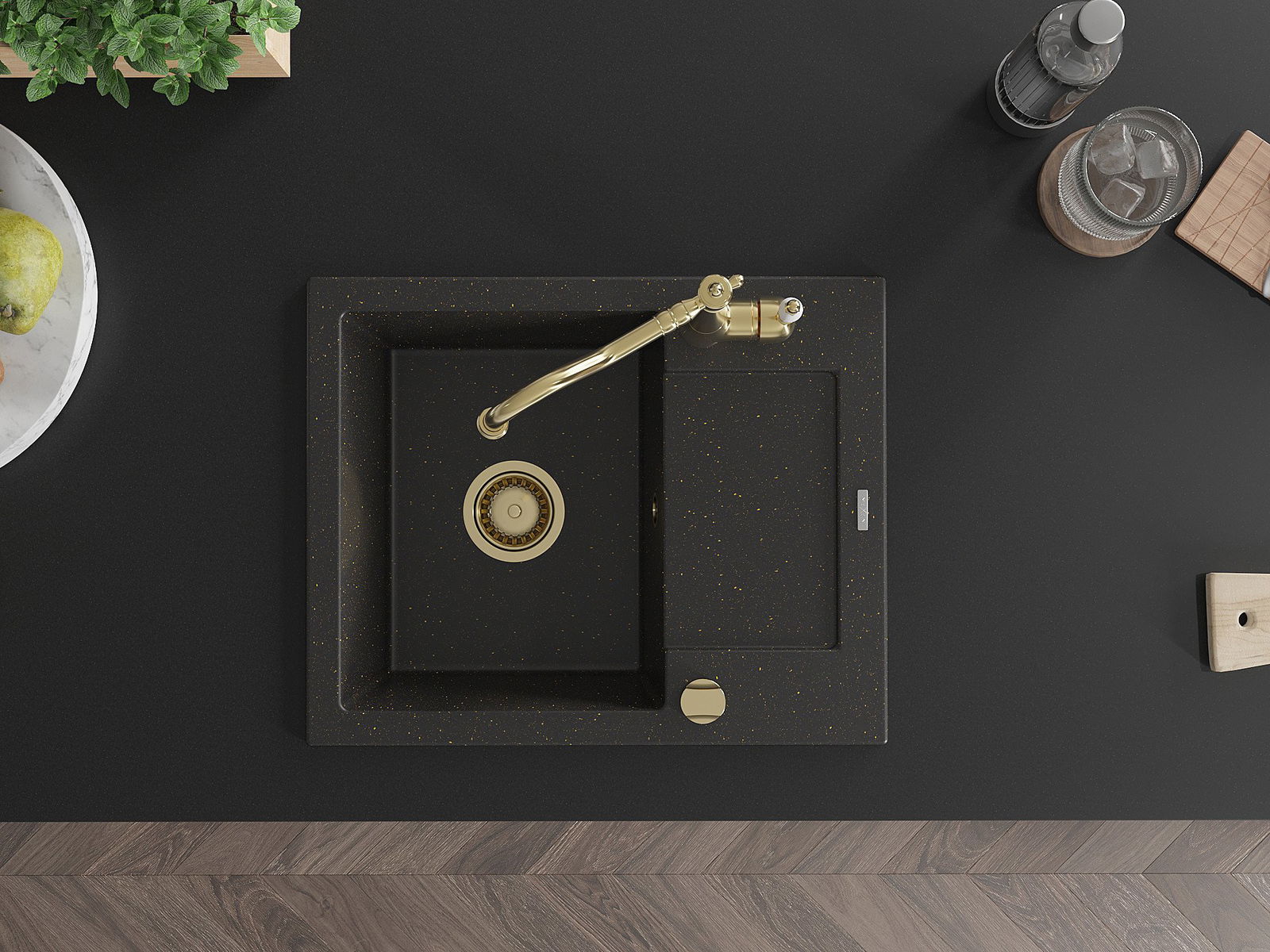 Mexen Enzo granitinė vienos kameros kriauklė su nutekėjimo sistema ir virtuviniu maišytuvu Carla, juoda/auksinis metalikas