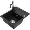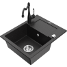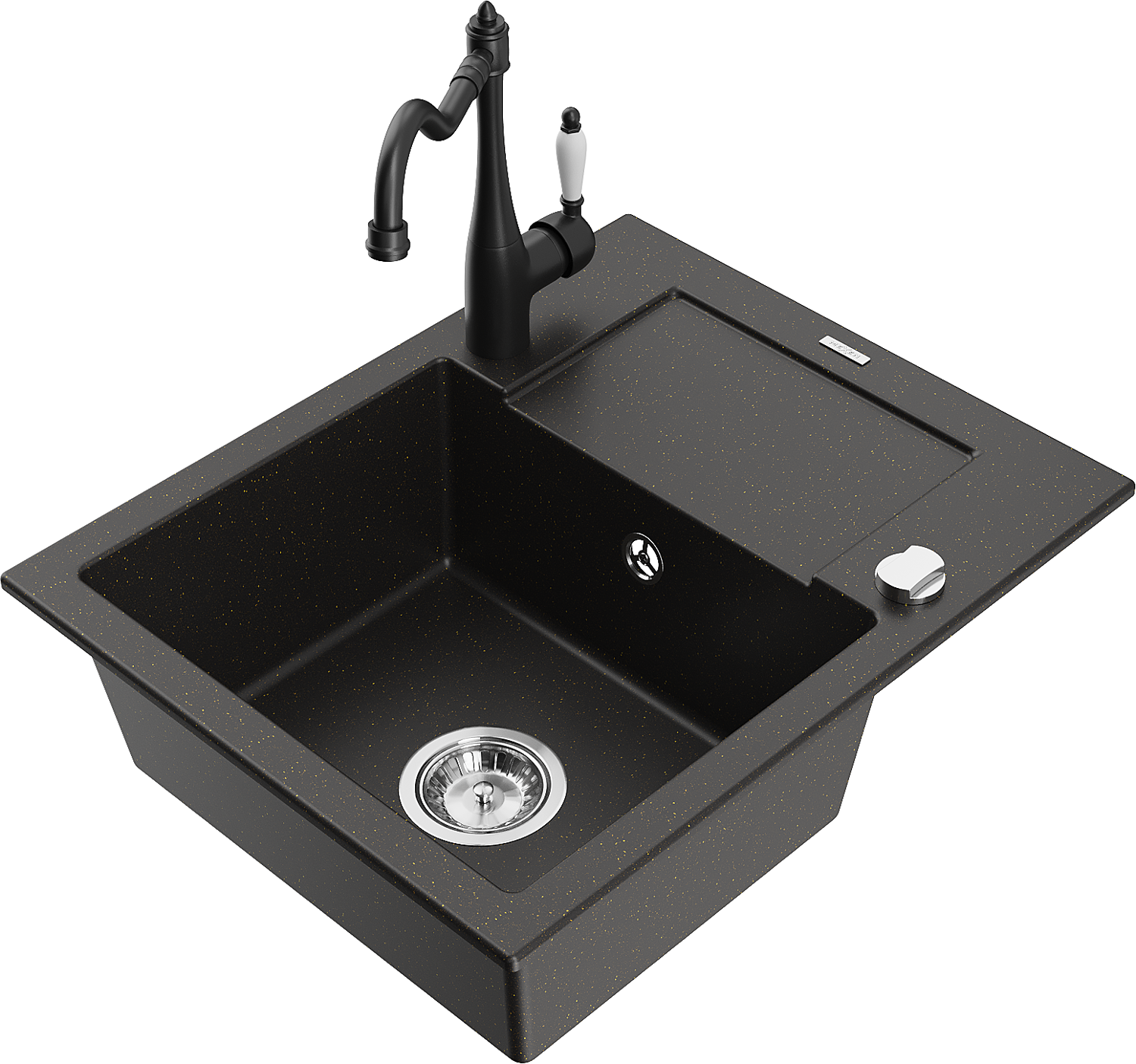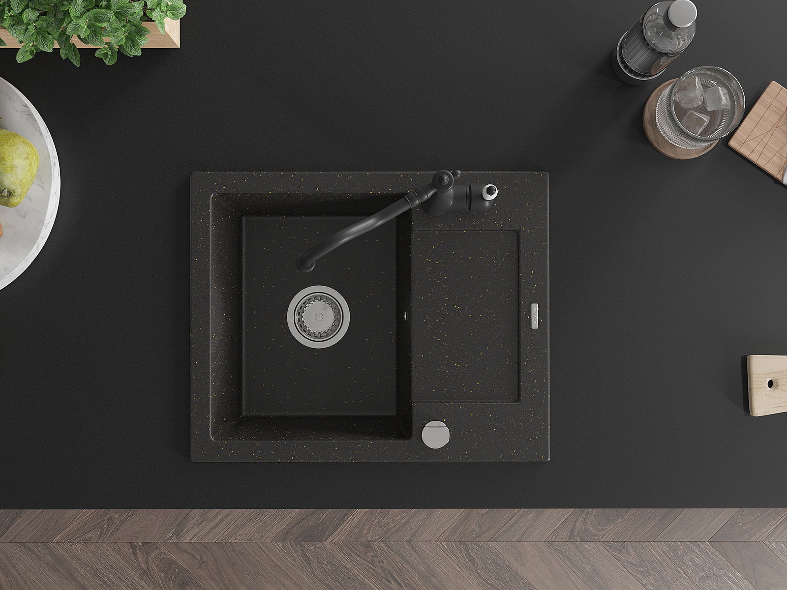 Mexen Enzo granitinė vieno dubenėlio virtuvės kriauklė su drenažu ir maišytuvu Carla, juoda/auksinė metalo spalva
