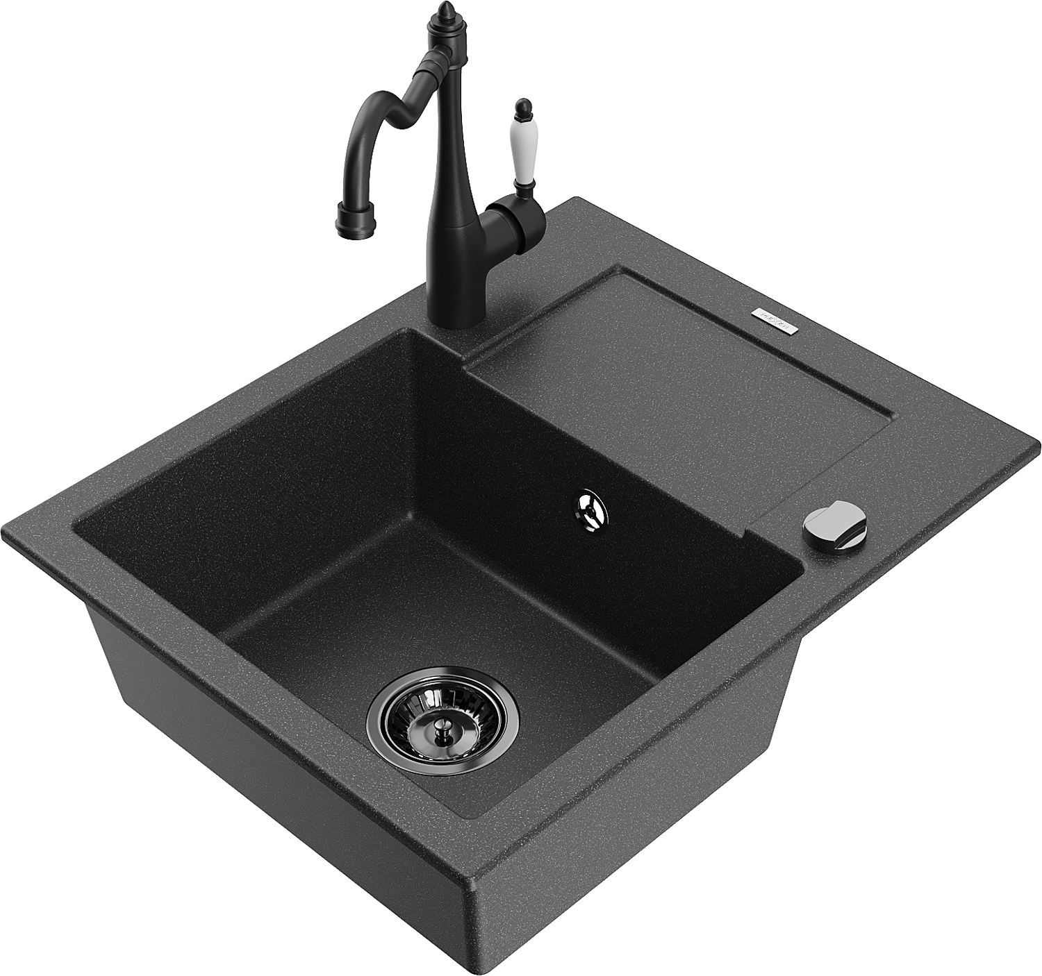 Mexen Enzo vienos kameros granitinė plautuvė su nutekamuoju paviršiumi ir virtuviniu maišytuvu Carla, juoda taškuota - 6506-76-?