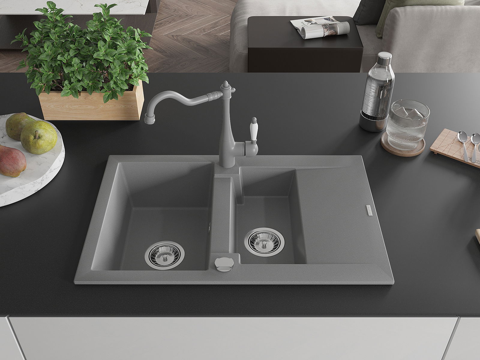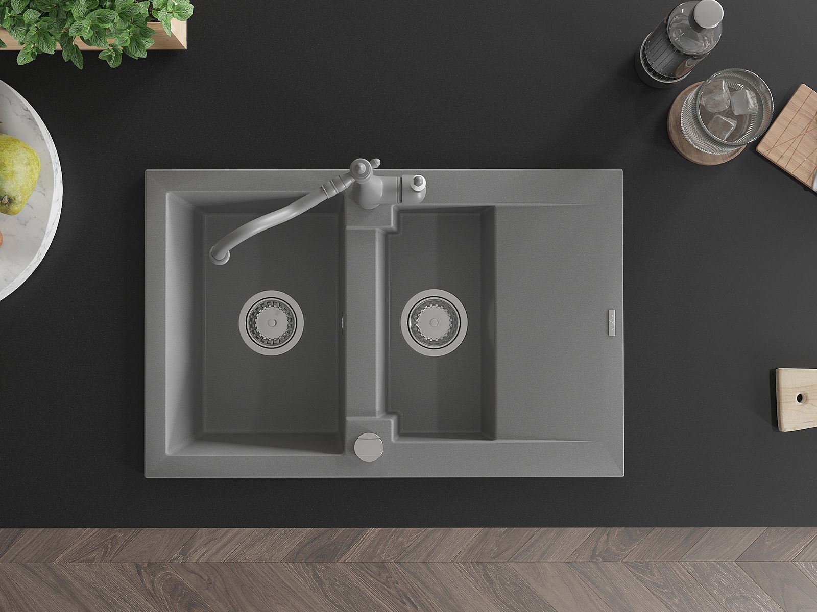 Mexen Gaspar granitinė plautuvė 1,5 dubens su nutekėjimo paviršiumi ir virtuviniu maišytuvu Carla, pilka - 6507-71-670700-71