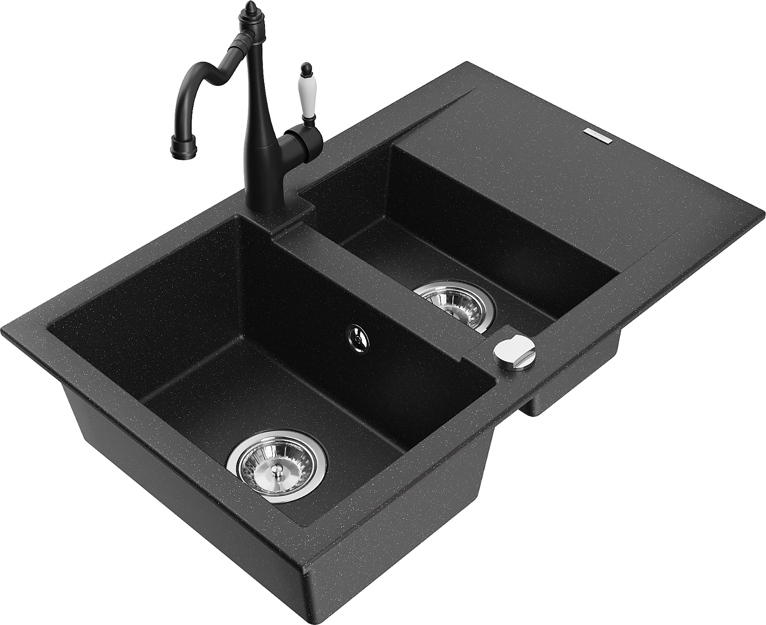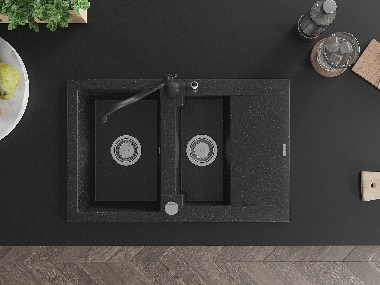 Mexen Gaspar 1,5 d. granitinė plautuvė su nusausinimo vieta ir virtuviniu maišytuvu Carla juoda/sidabro metalo