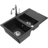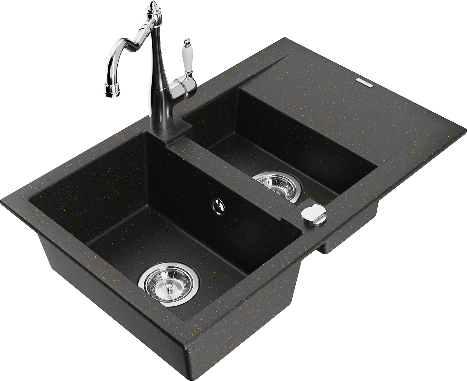 Mexen Gaspar 1,5-jų dalių granito plautuvė su nutekėjimu ir virtuviniu maišytuvu Carla, juoda/auksinė metalika