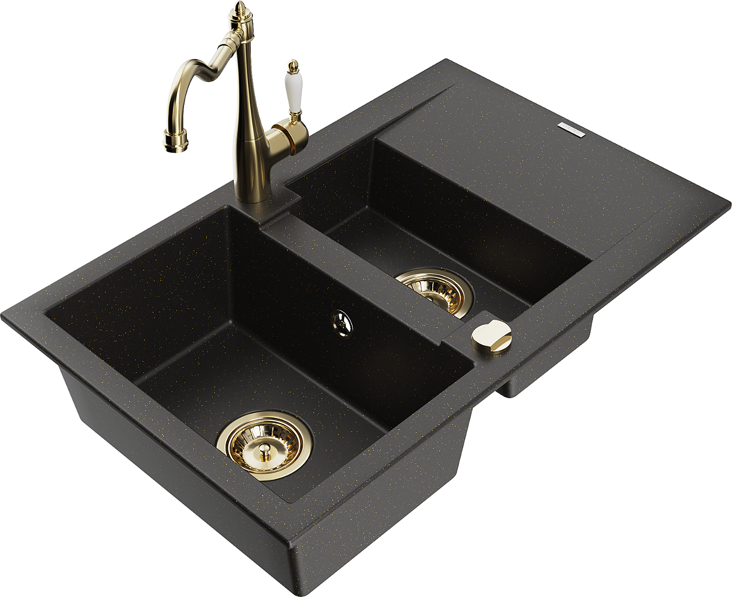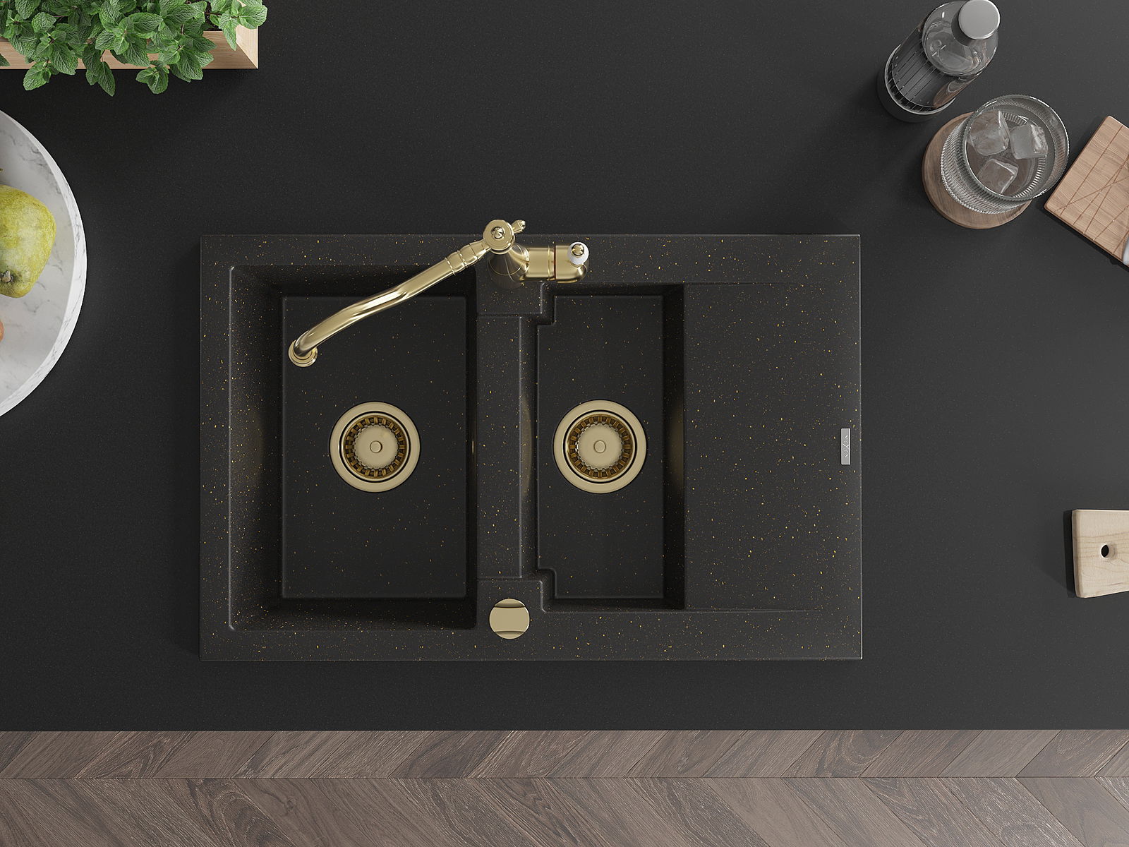 Mexen Gaspar 1,5 skylių granitinė kriauklė su nutekėjimu ir virtuvės maišytuvu Carla, juoda/aukso metalo spalvos