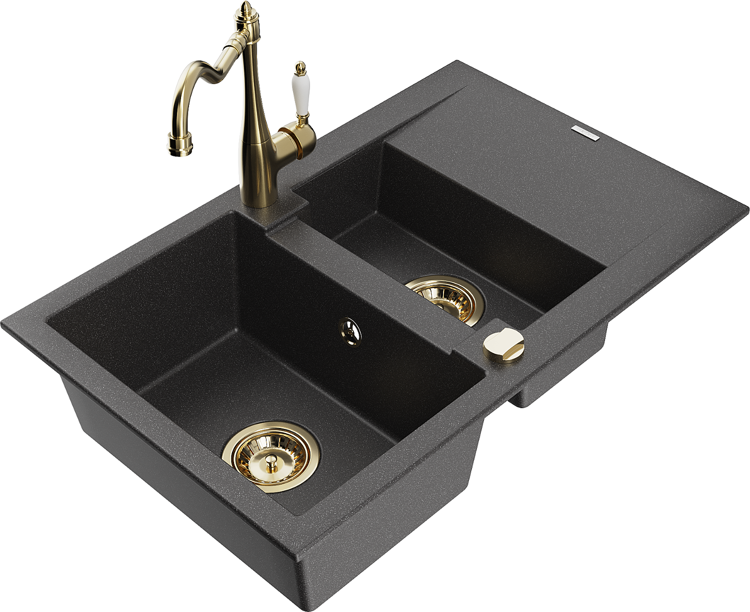 Mexen Gaspar granitinė 1,5 kamerų kriauklė su nutekėjimu ir virtuvės maišytuvu Carla, juoda margė - 6507-76-670700-50