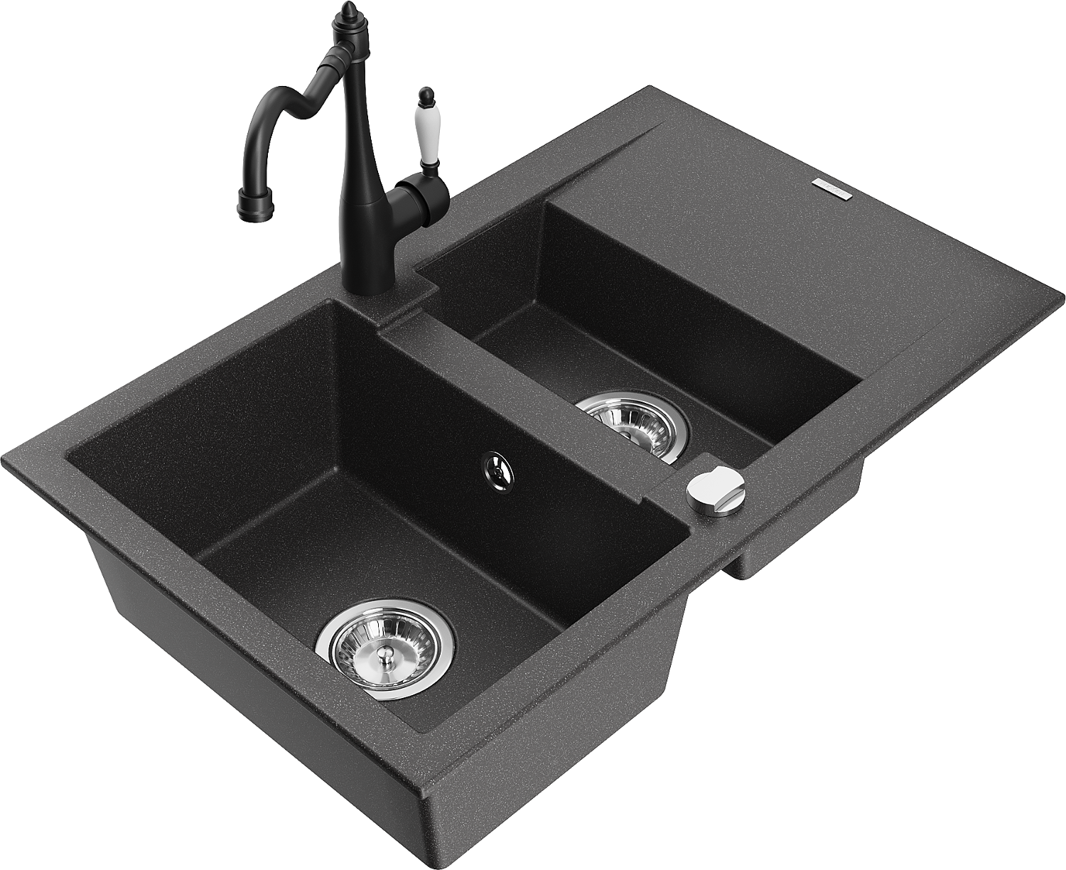 Mexen Gaspar granitinė kriauklė 1,5 kamerų su drenažu ir virtuviniu maišytuvu Carla, juoda taškuota - 6507-76-670700-70