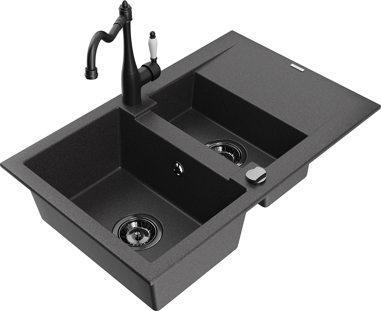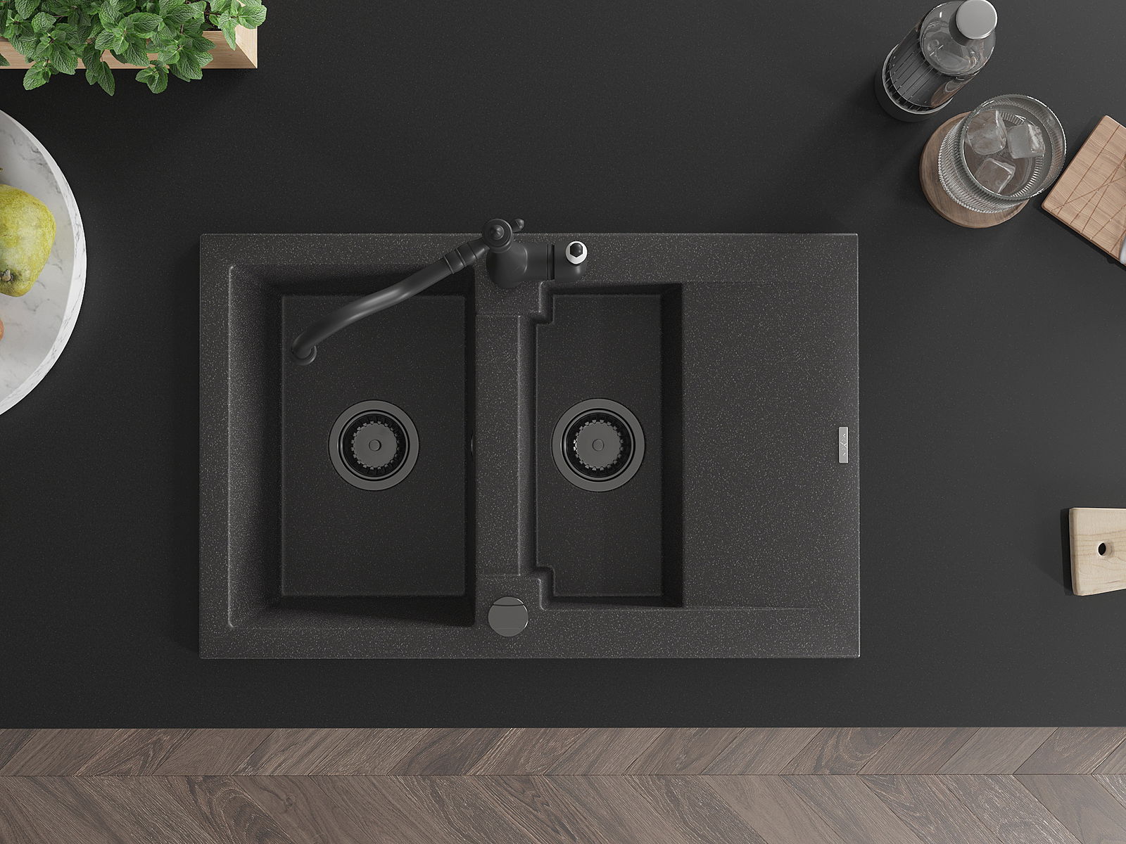 Mexen Gaspar granitinė 1,5 dubenų plautuvė su nutekamuoju paviršiumi ir virtuviniu maišytuvu Carla, juoda su taškeliais