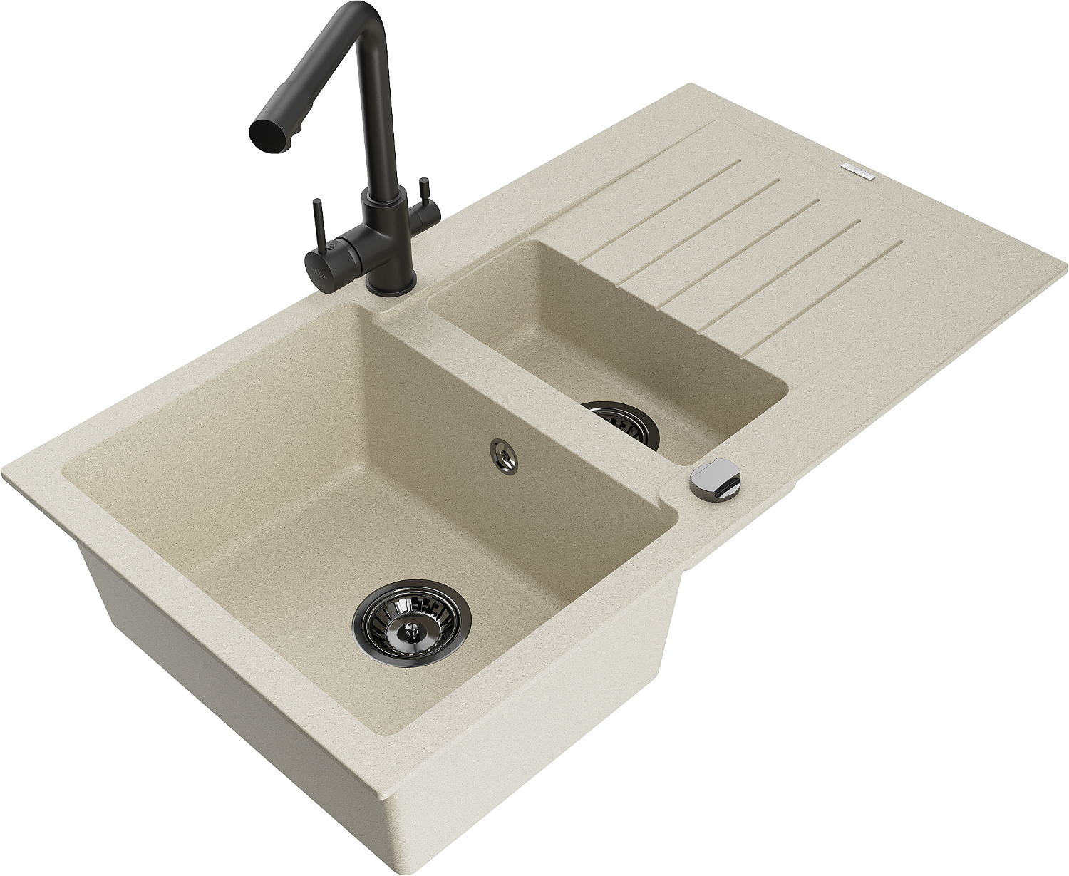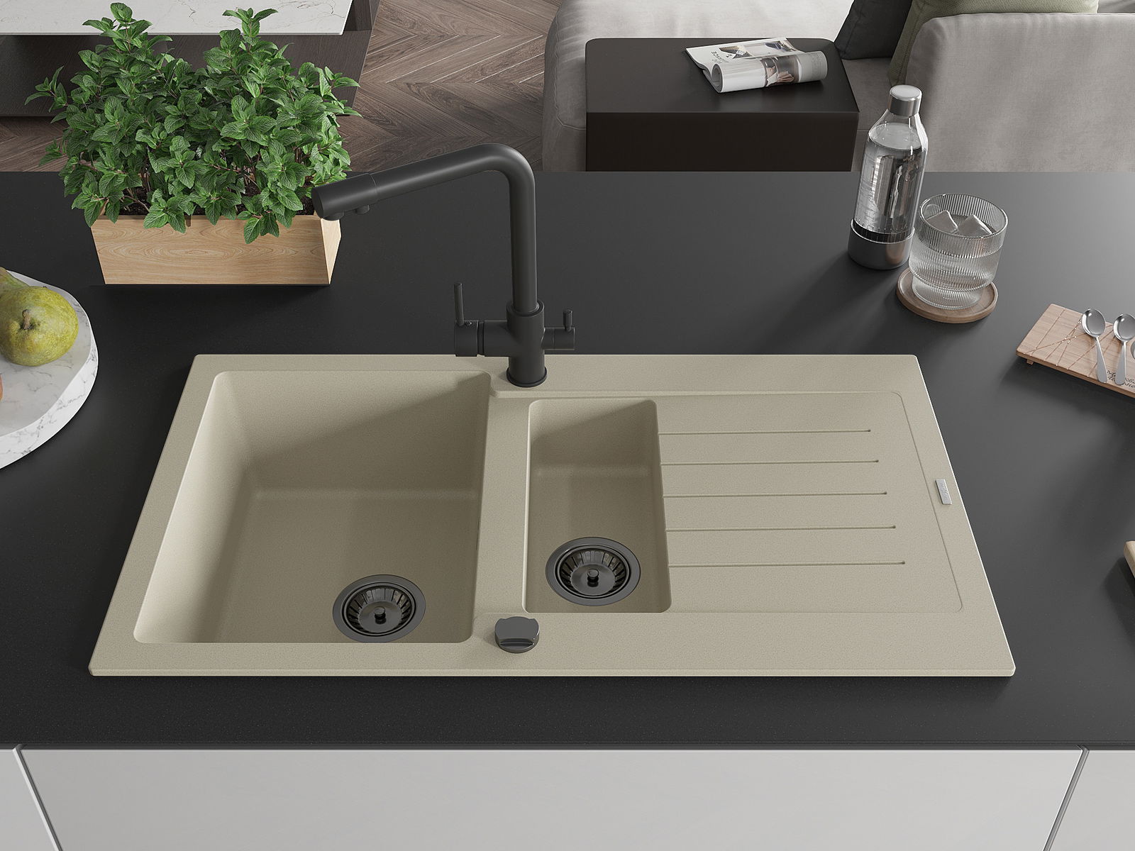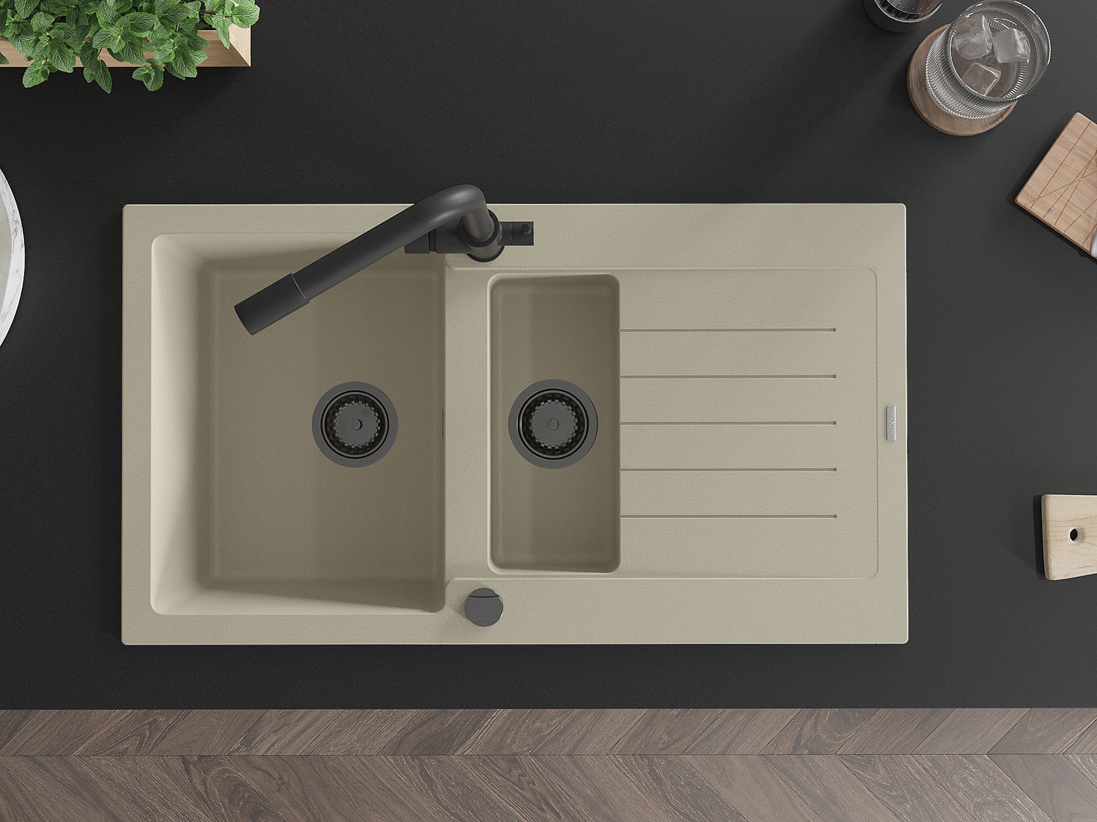 Mexen Matias granito kriauklė 1,5 skylių su nutekėjimo lentyna ir Duero virtuvės maišytuvu, smėlio spalvos - 6502-69-671600-70