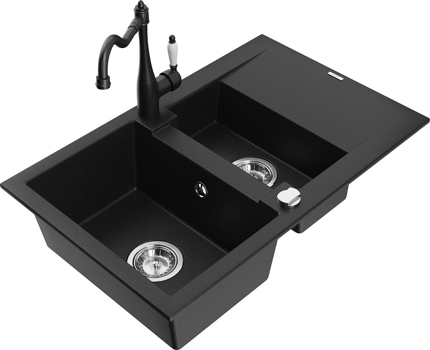 Mexen Gaspar granitinė 1,5 skylių kriauklė su lašintuvu ir virtuviniu maišytuvu Carla, juoda - 6507-77-670700-70