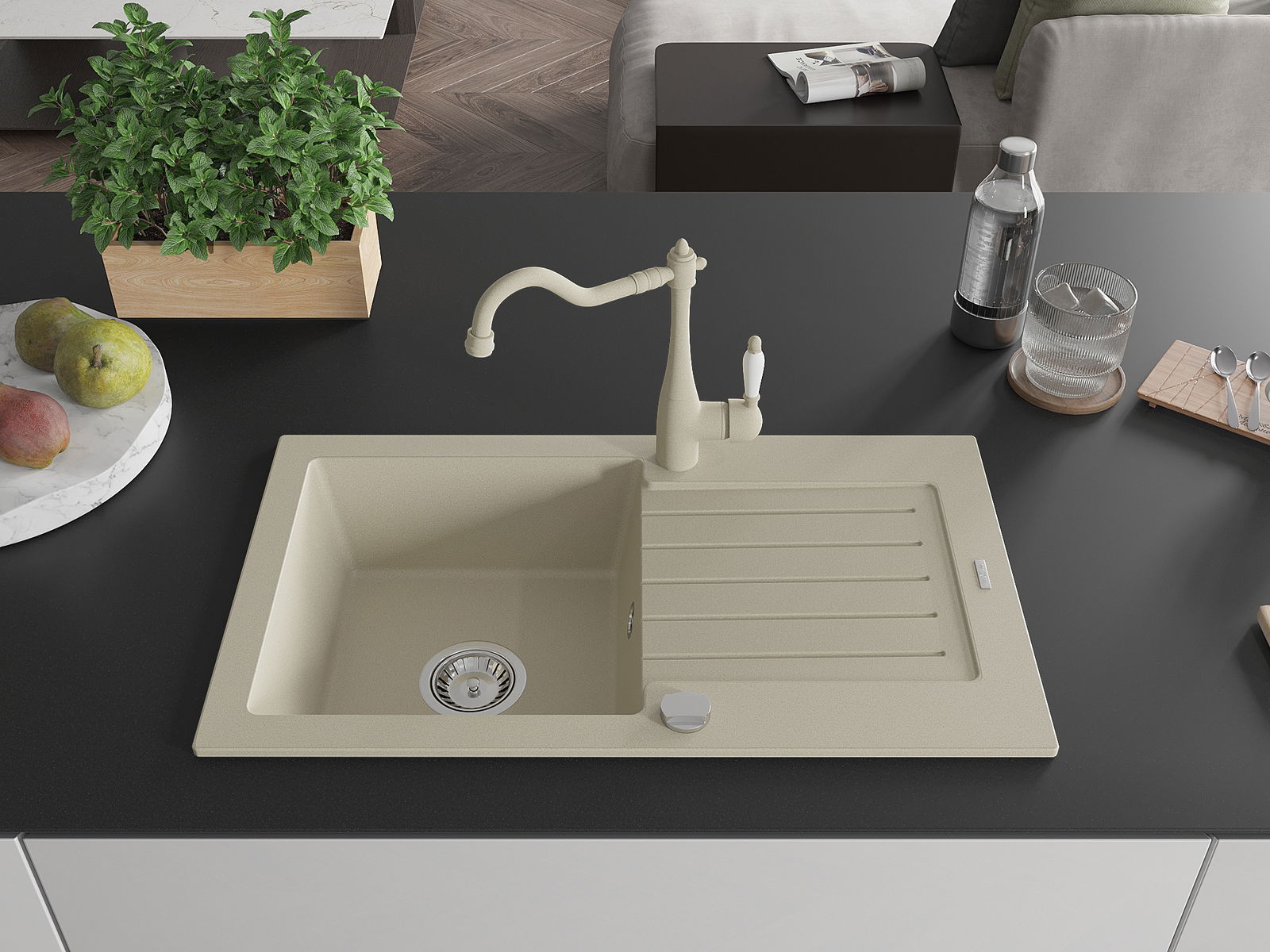 Mexen Pablo granito plautuvė su viena kamera ir nutekėjimu bei virtuvės maišytuvu Carla, smėlio spalvos - 6510-69-670700-69