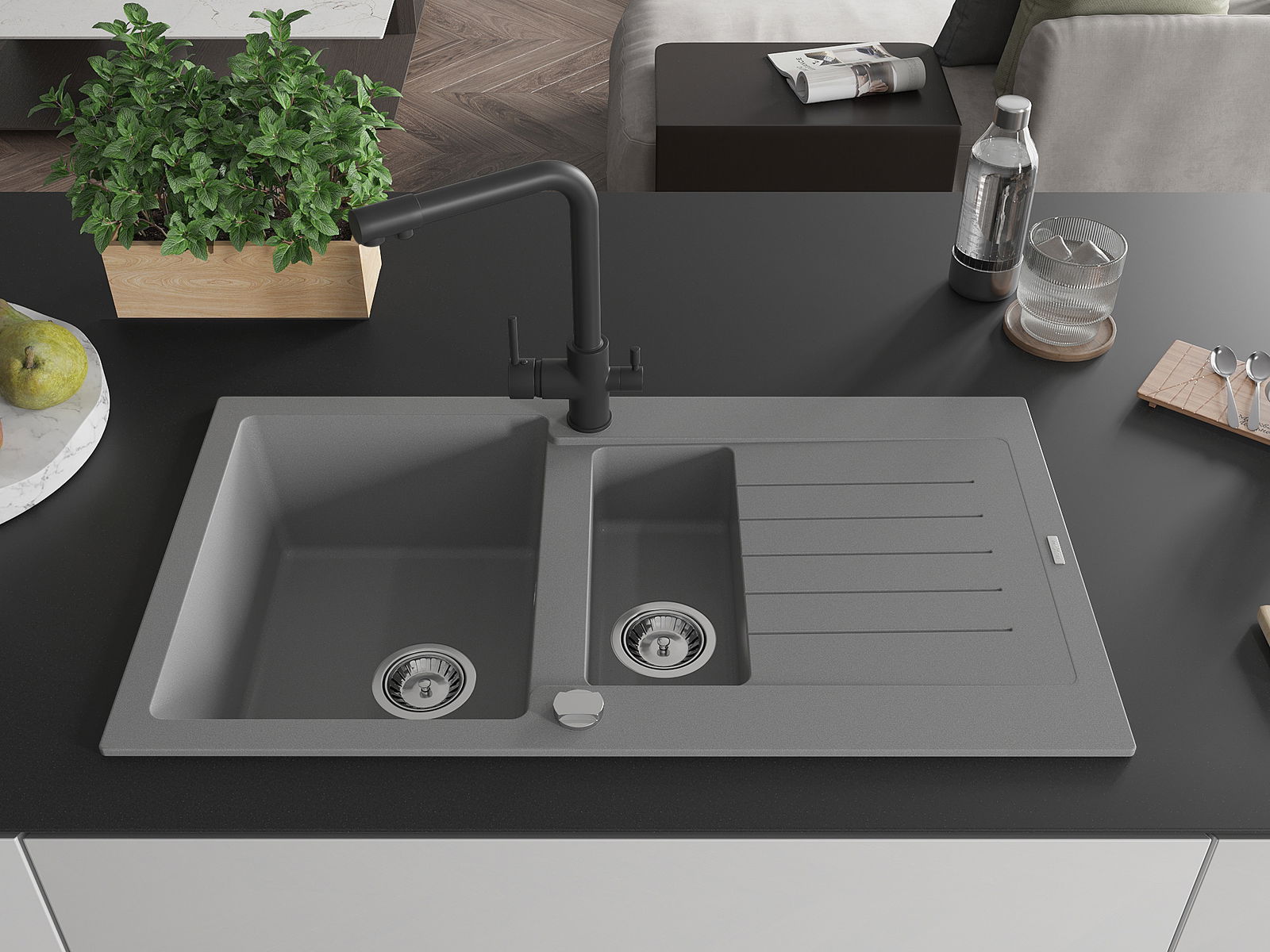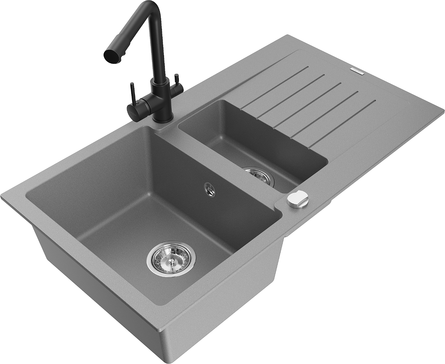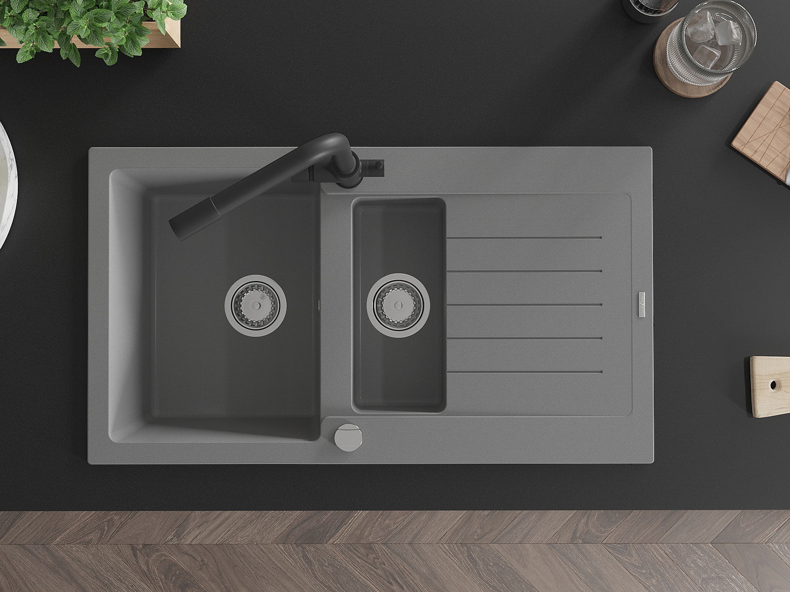 Mexen Matias granito plautuvė 1,5 skyrių su lašeliu ir virtuvės maišytuvu Duero, pilkas - 6502-71-671600-70
