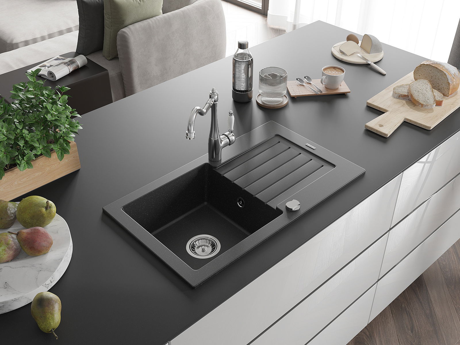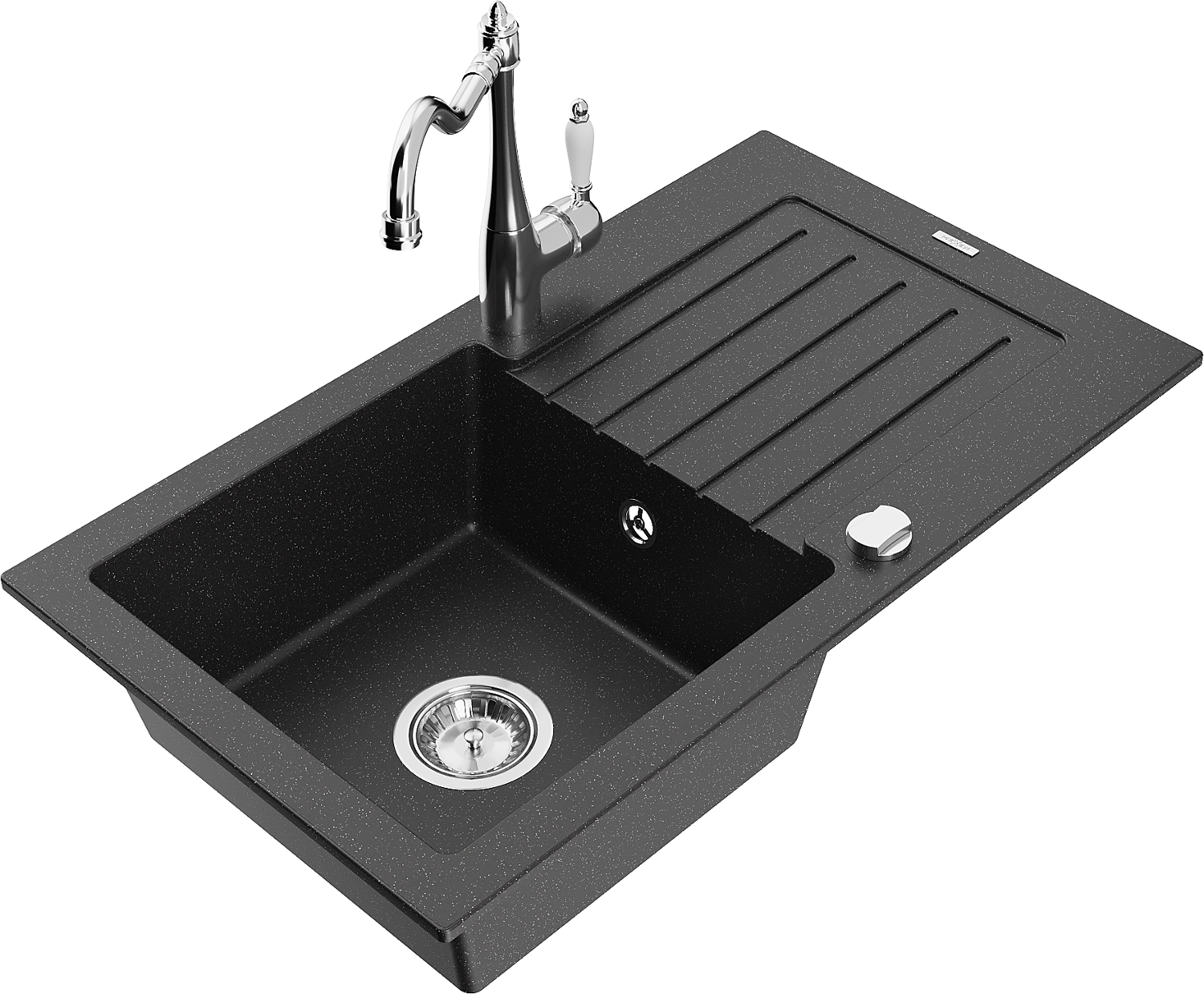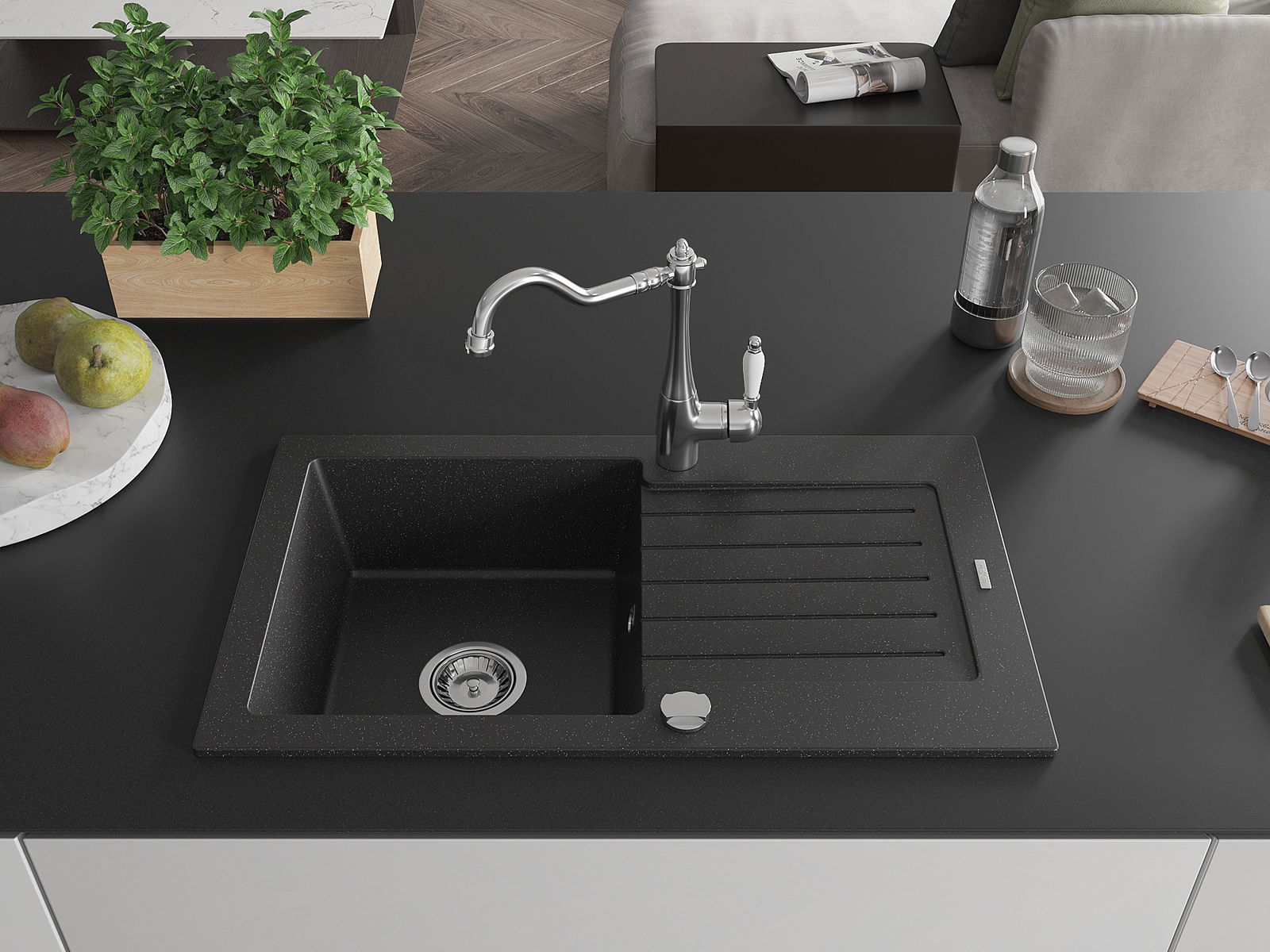 Mexen Pablo vienos plautuvės granito plautuvė su nutekėjimo lentyna ir virtuviniu maišytuvu Carla, juoda/sidabrinis