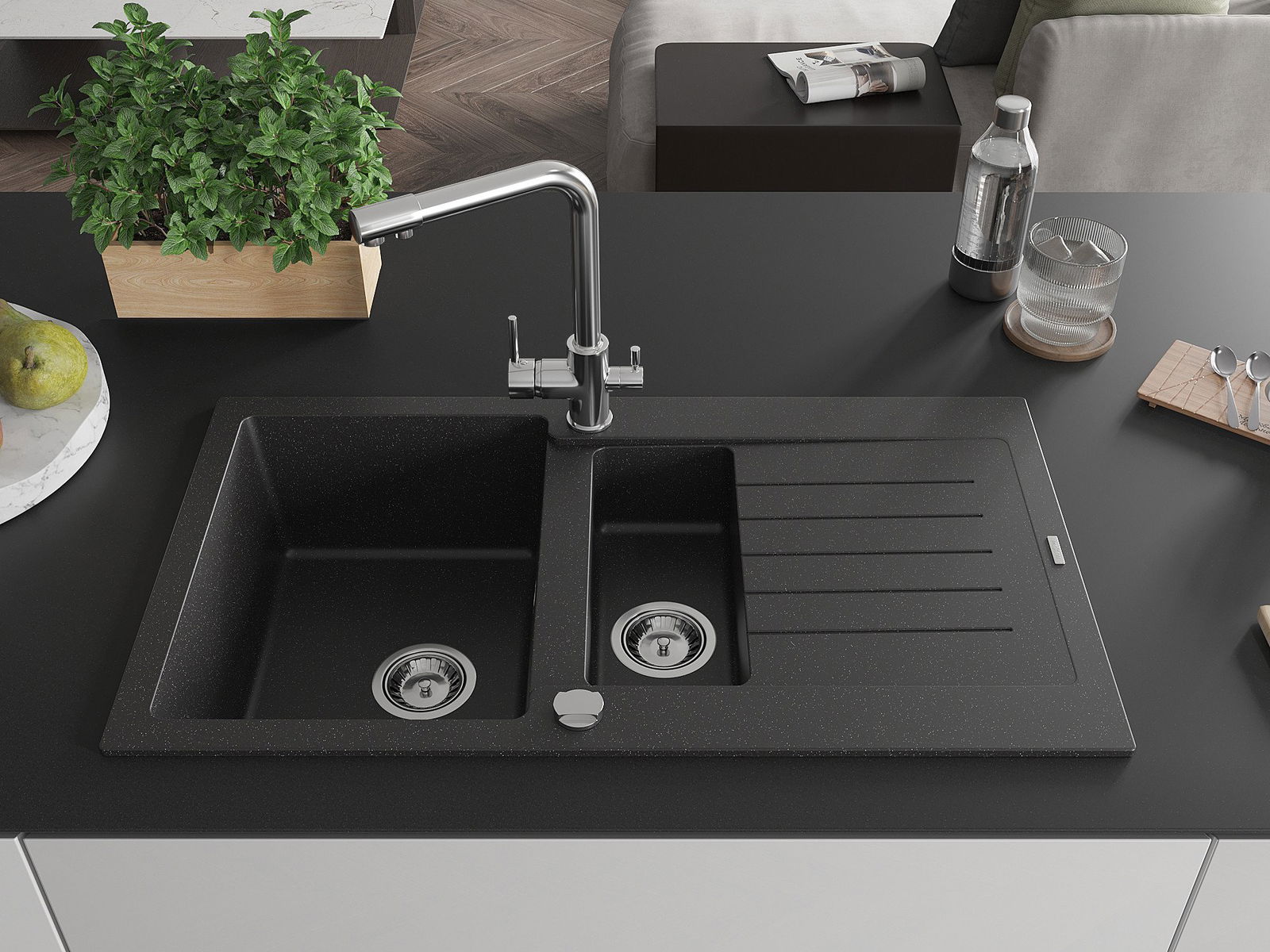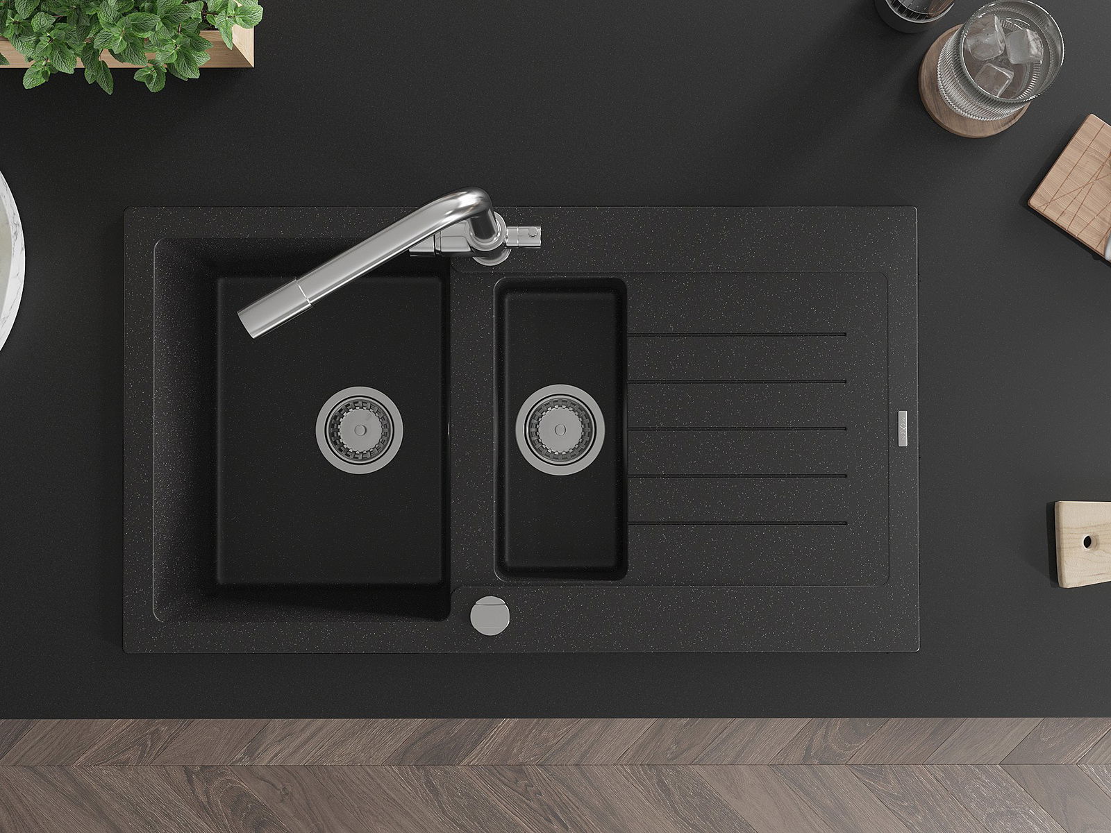 Mexen Matias granitinis plautuvė 1,5 kambario su nuvarveju ir virtuvės maišytuvu Duero, juodas/sidabrinis metalikas - 6502-73-6?
