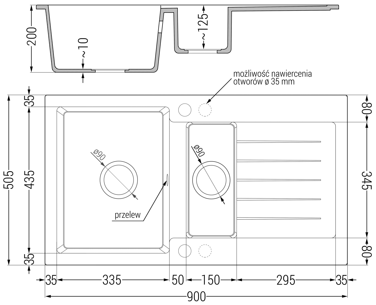 Kriauklė turi 2 iš anksto frezuotas skyles, kurių skersmuo yra 35 mm, skirtas savarankiškam išmušimui. Jas galima naudoti, pavyzdžiui, skysčio dozatoriaus montavimui, kuris pašalins plastikinių butelių buvimą virtuvėje ir suteiks jai elegantišką apdailą.
