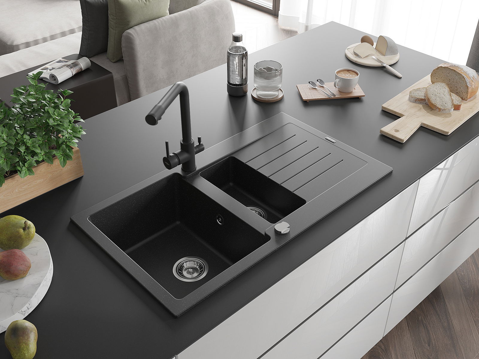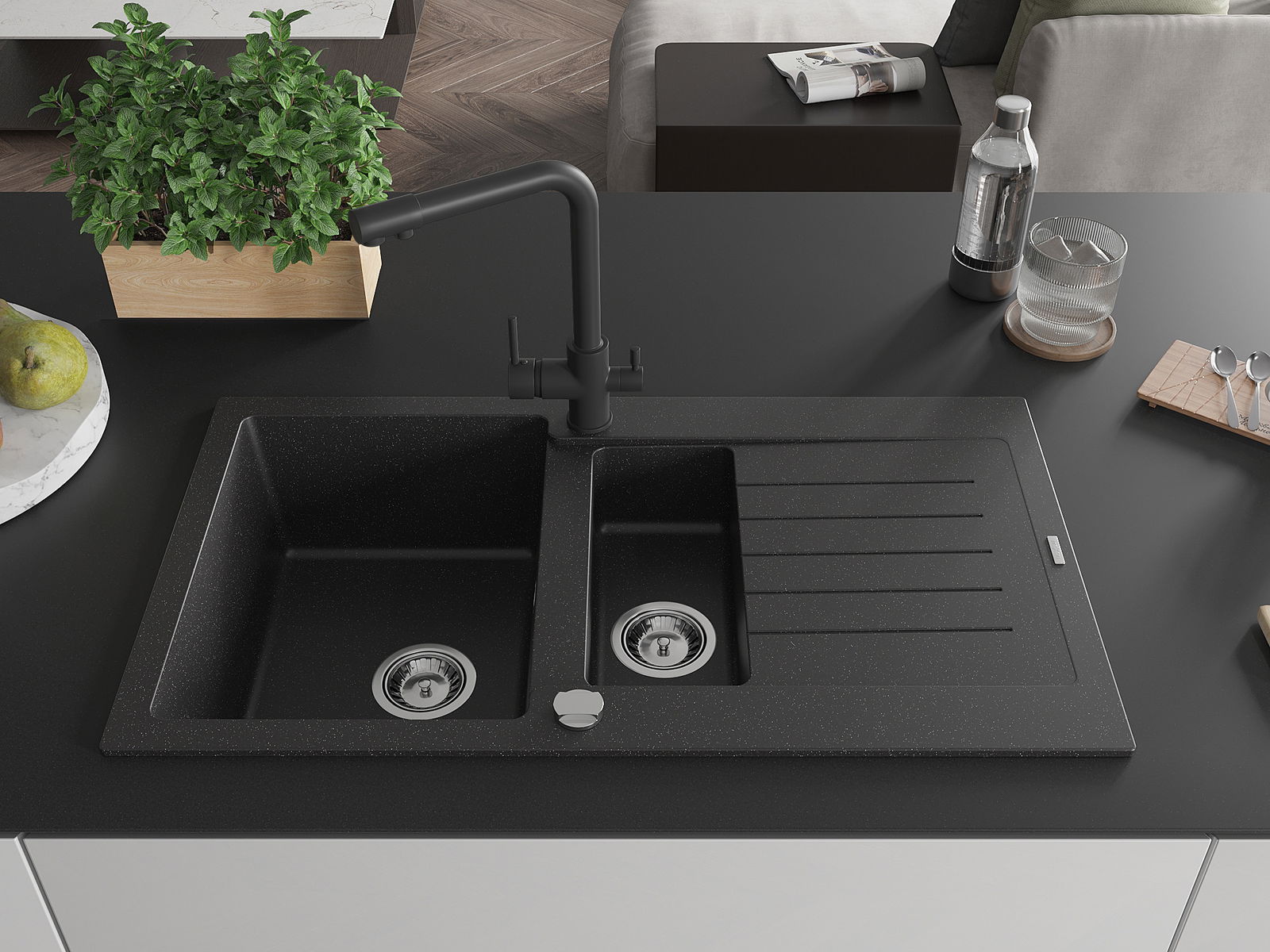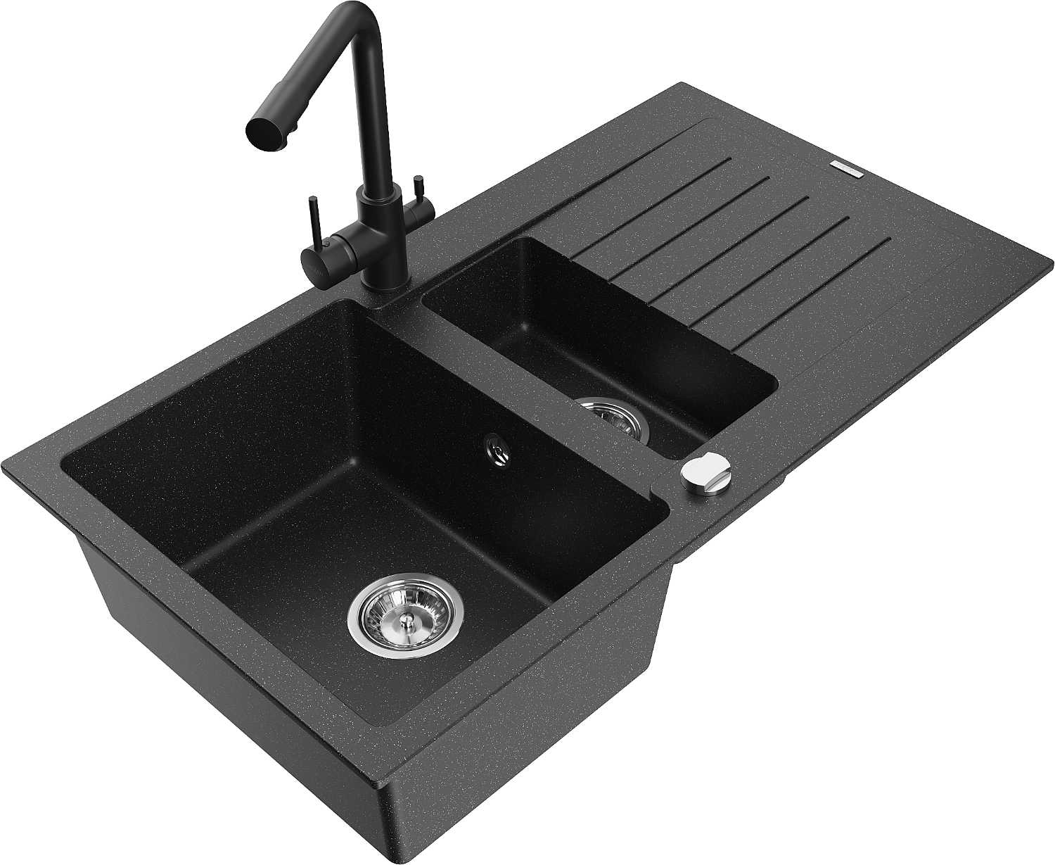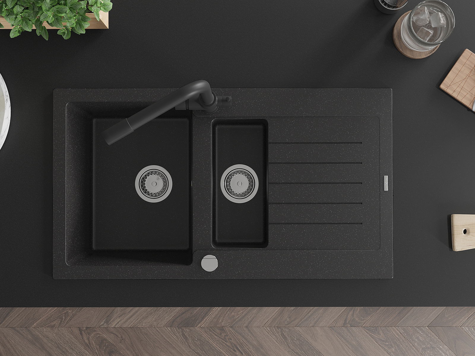 Mexen Matias granitinė virtuvės plautuvė su pusantro stalčiumi, nusausinimo zona ir maišytuvu Duero, juoda/sidabrinės