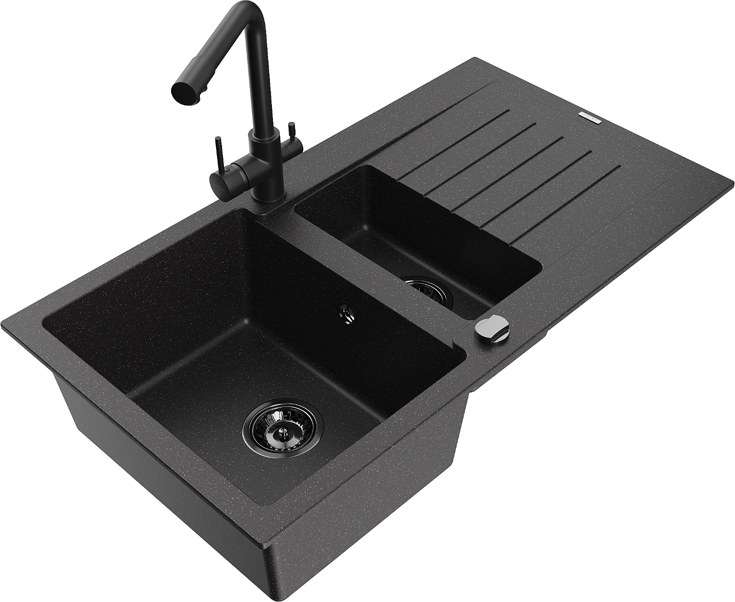 Mexen Matias granito plautuvė 1,5 skylių su nutekėjimu ir virtuviniu maišytuvu Duero, juoda/sidabrinė - 6502-73-671600-70-B
