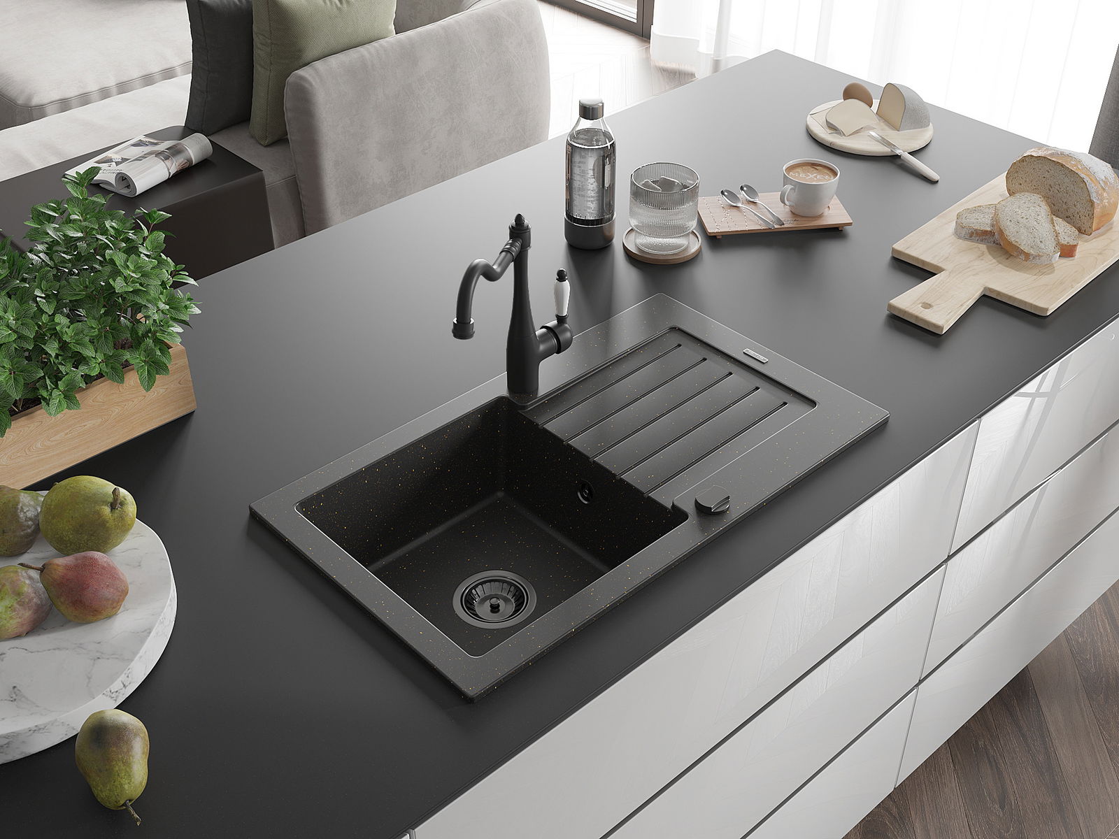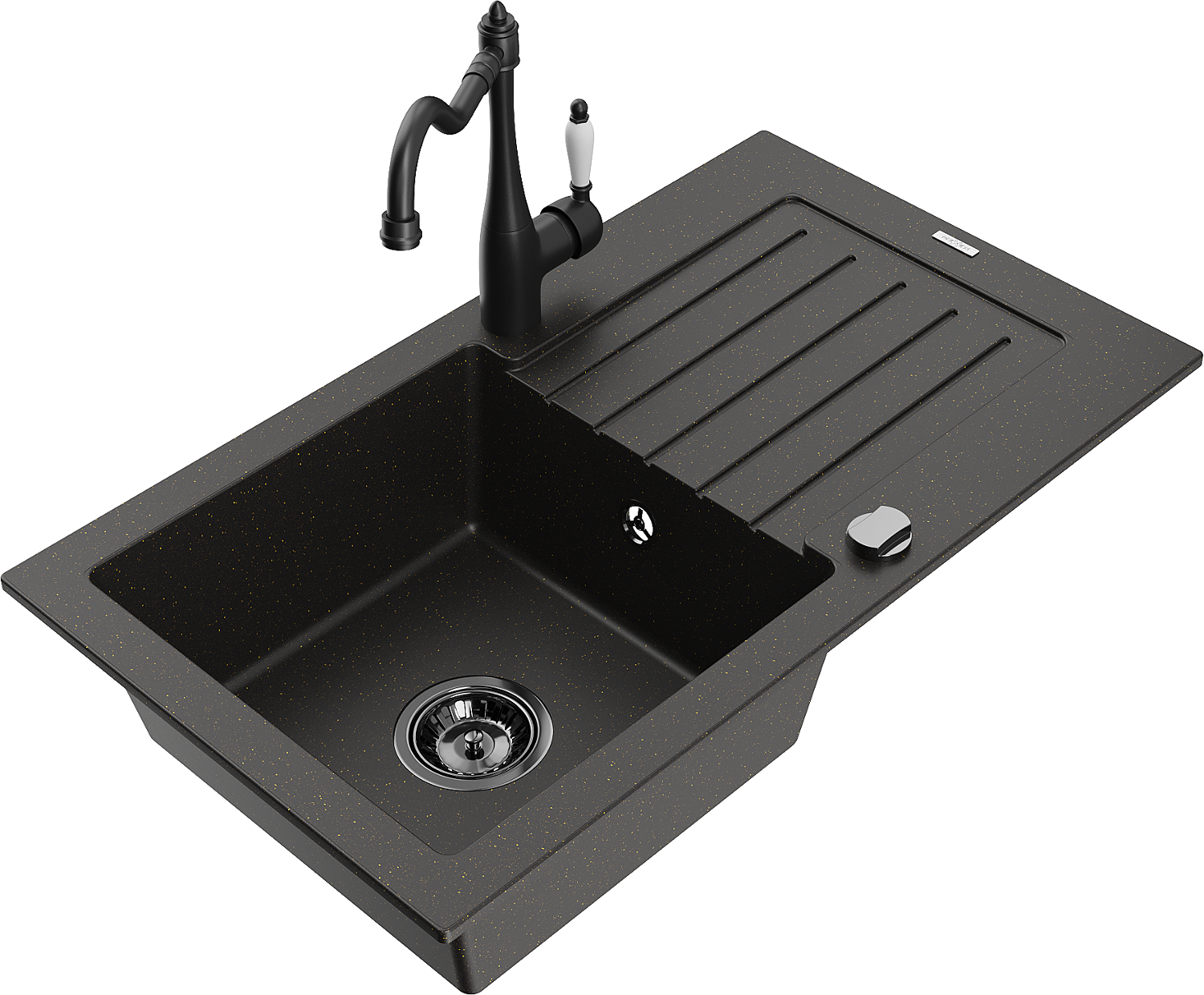 Mexen Pablo granitinė vienos kameros plautuvė su džiovykle ir virtuviniu maišytuvu Carla, juodas/auksinis metalikas