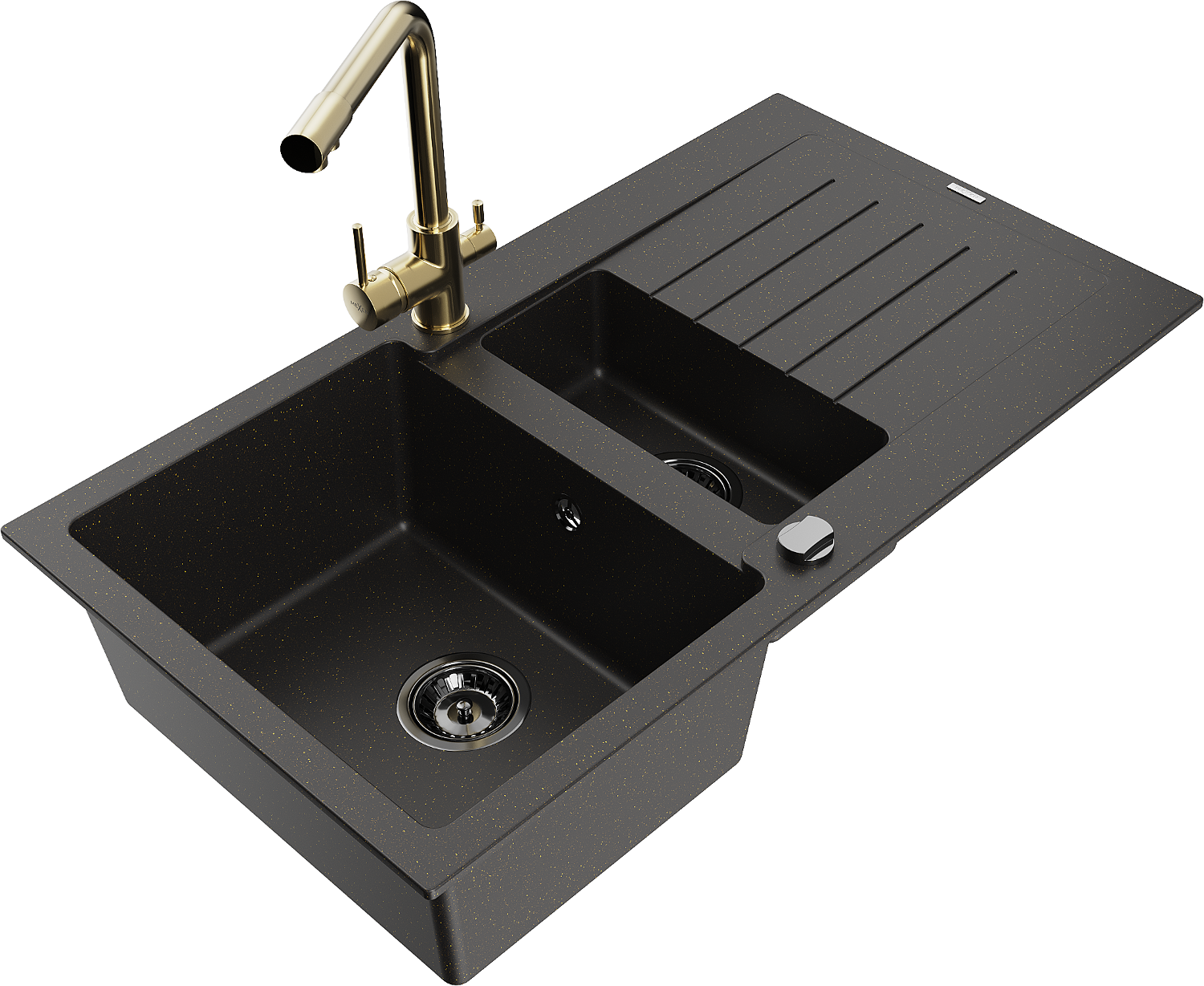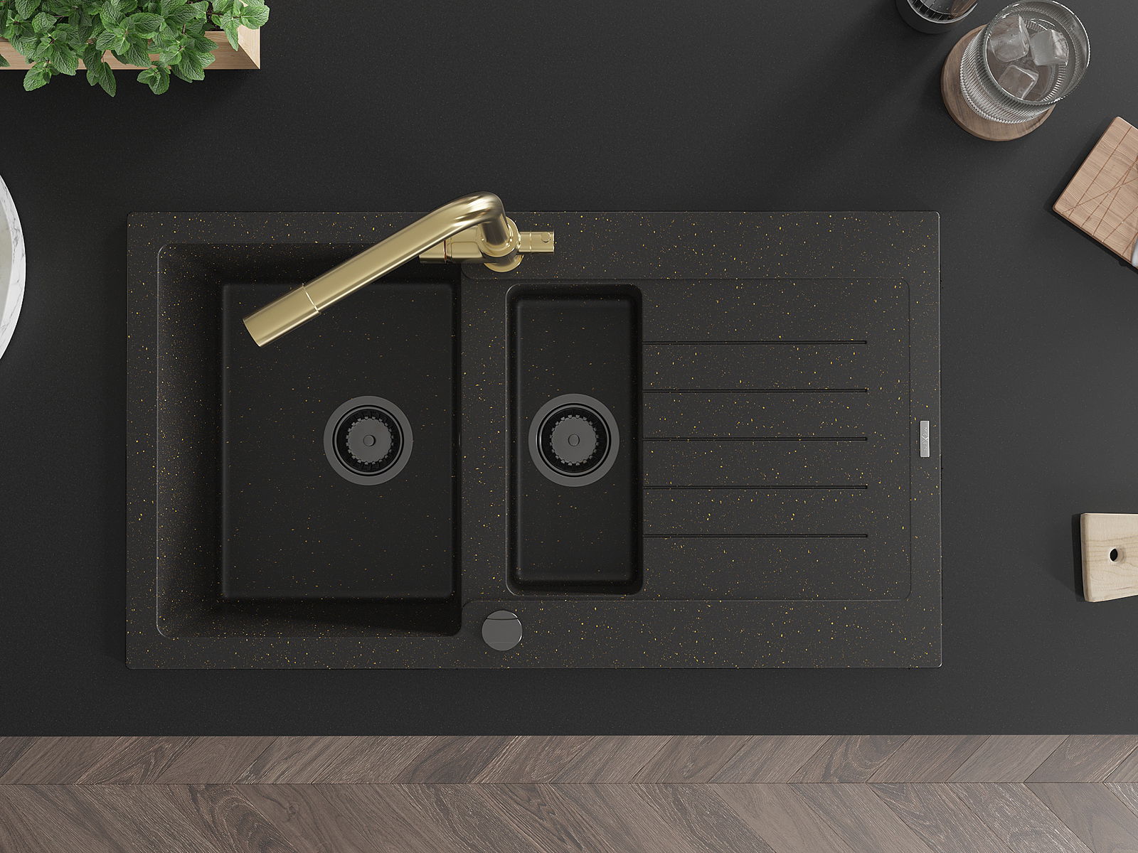 Mexen Matias granito plautuvė 1,5 skyrių su nuvarvėjimu ir virtuvės maišytuvu Duero, juoda/auksinė - 6502-75-671600-50-B