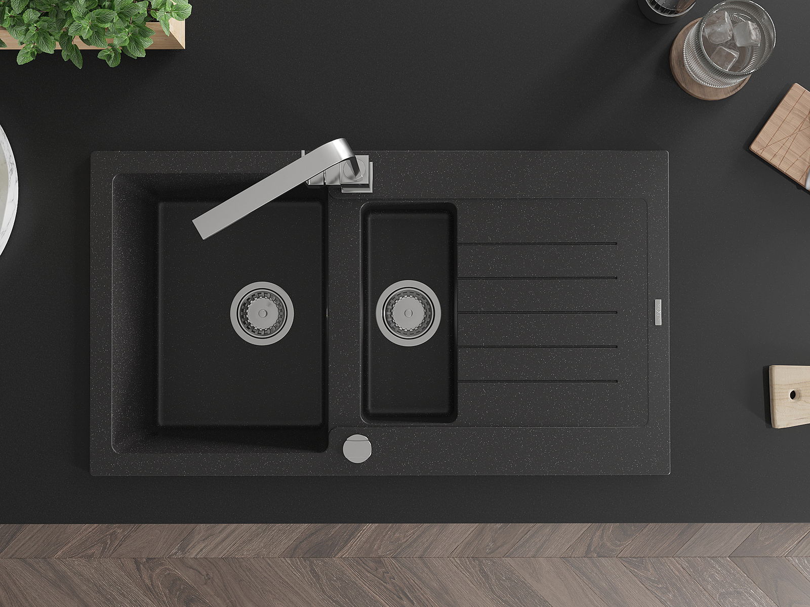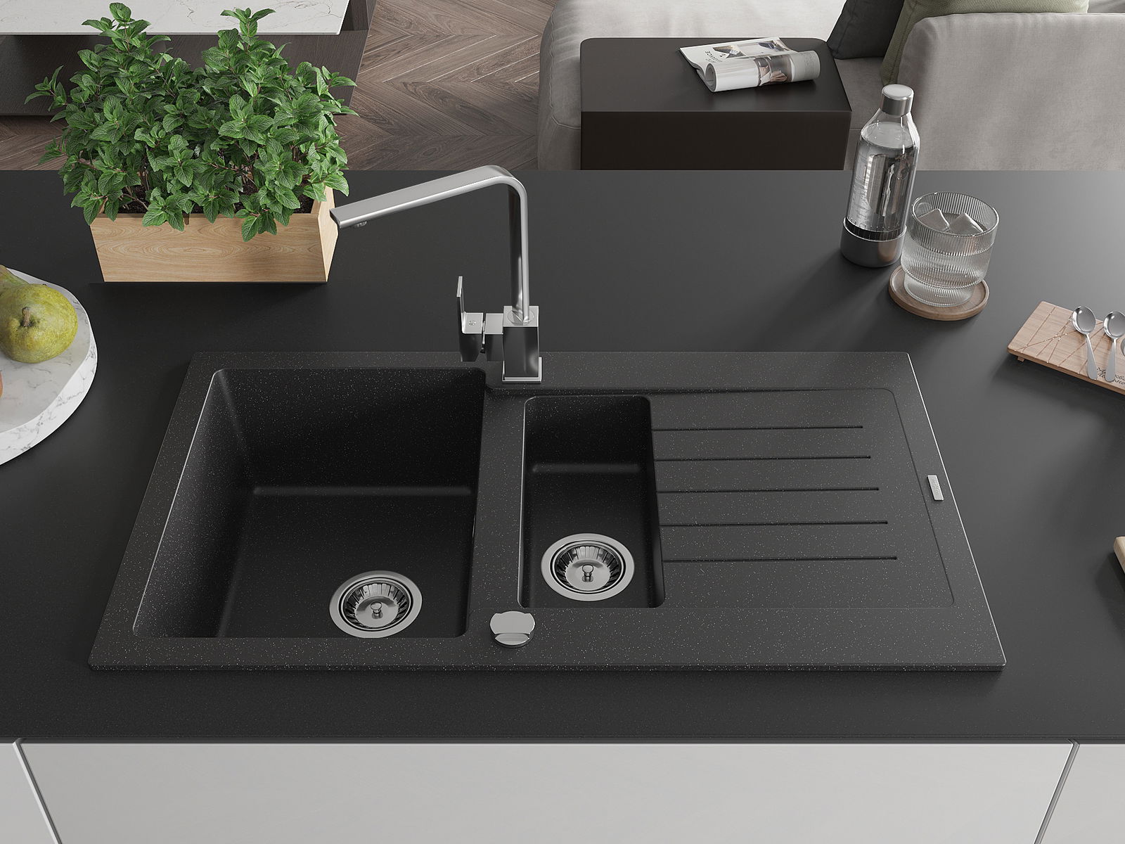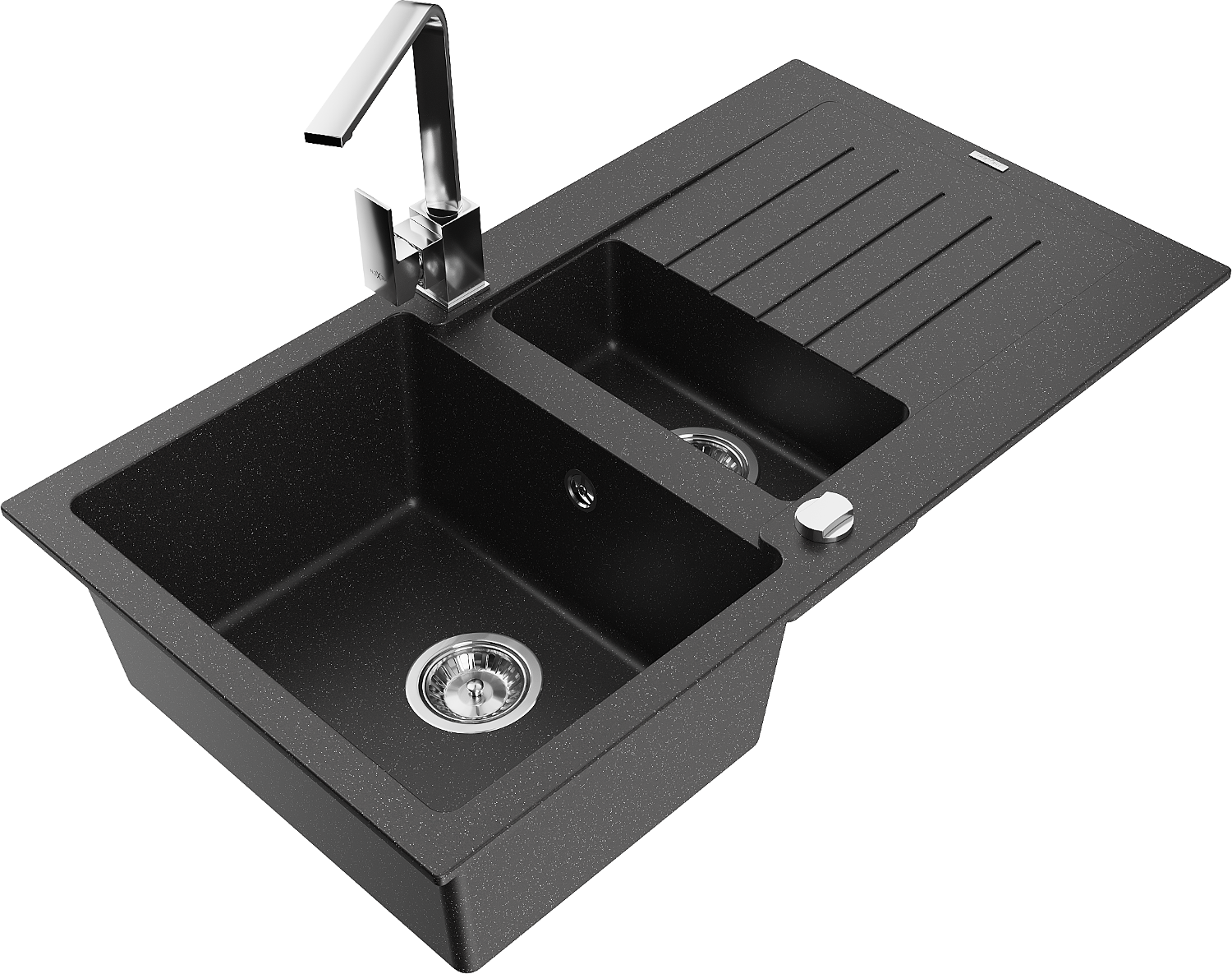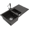 Mexen Matias granitinė virtuvės plautuvė 1,5 kambario su nuvarvėjimu ir virtuvės maišytuvu Rita, juoda/sidabrinė