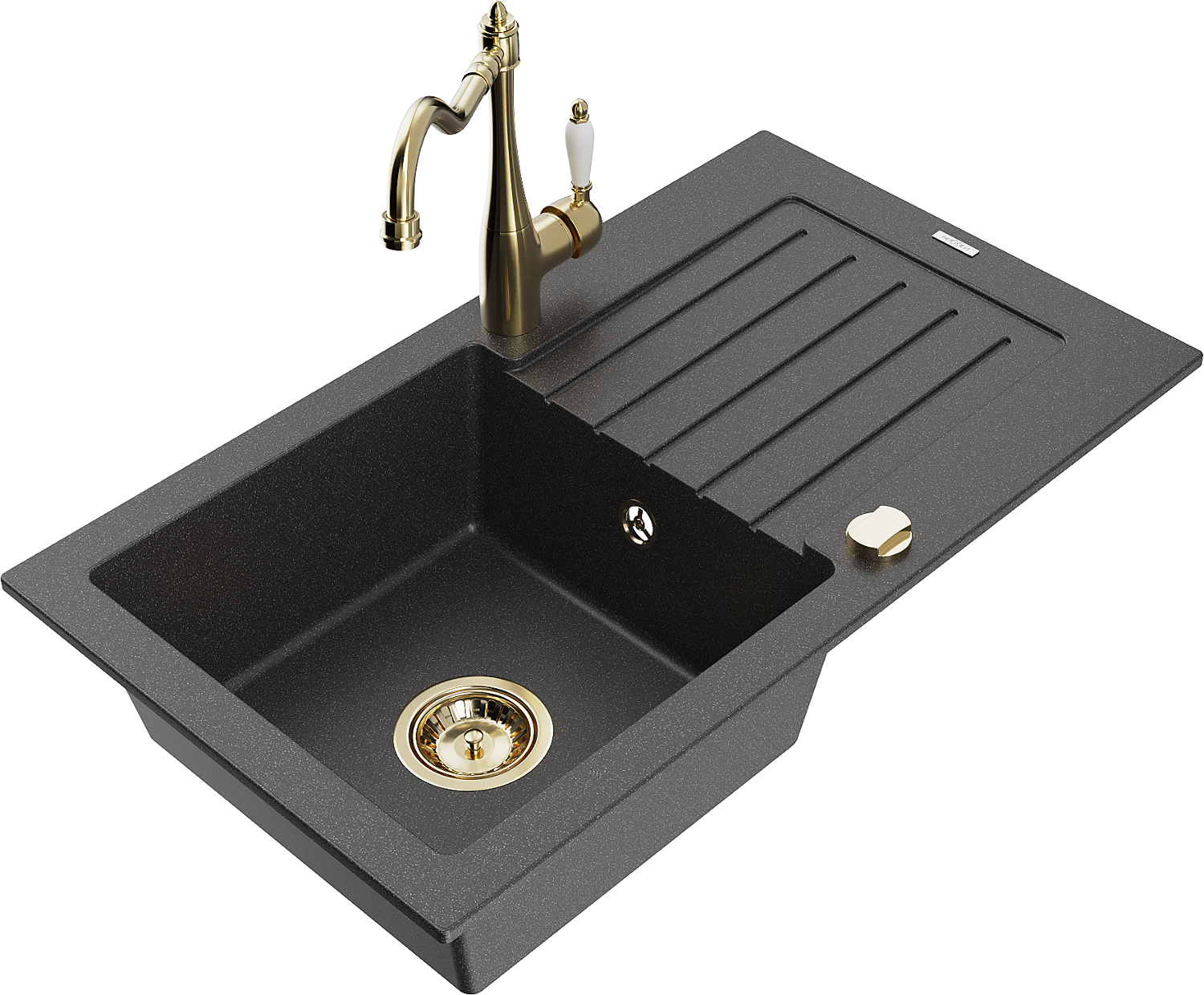 Mexen Pablo vienos komoros granitinis kriauklė su lašeliu ir virtuvės maišytuvu Carla, juodas su dėmelėmis