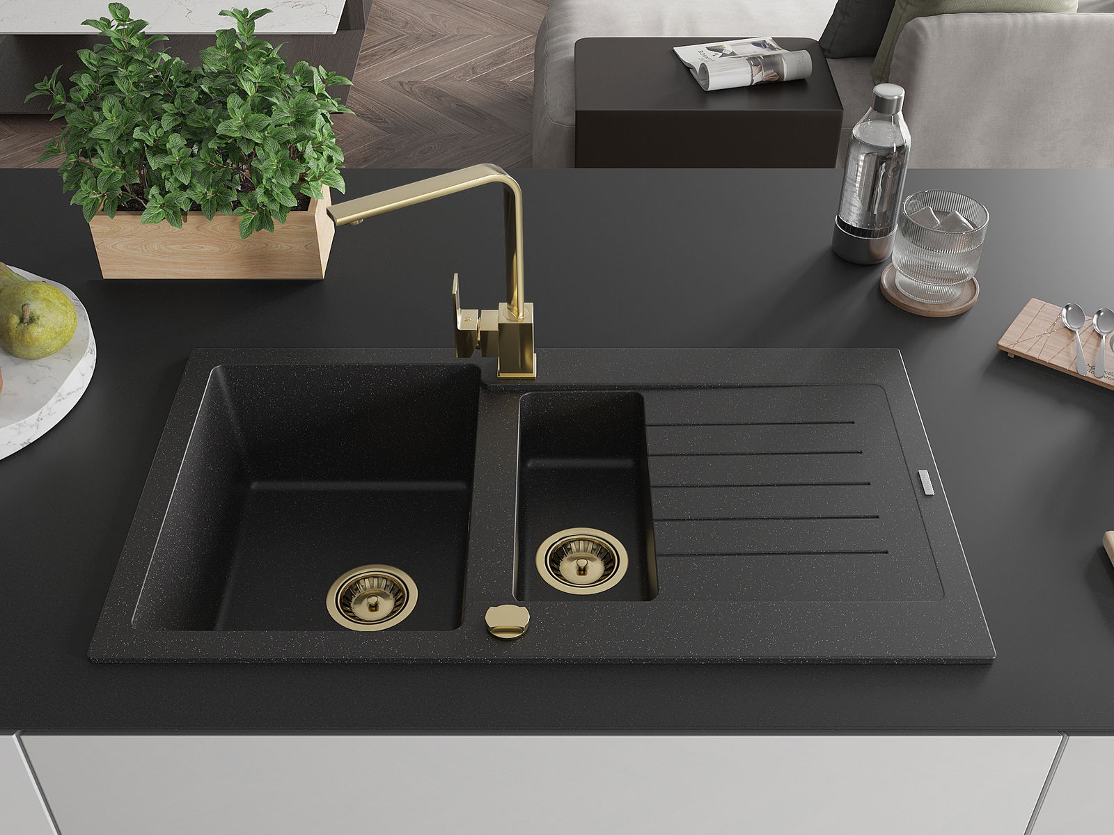 Mexen Matias granitinė virtuvės kriauklė su 1,5 skyriaus, su nutekėjimu ir virtuvės maišytuvu Rita, juodos/sidabrinės