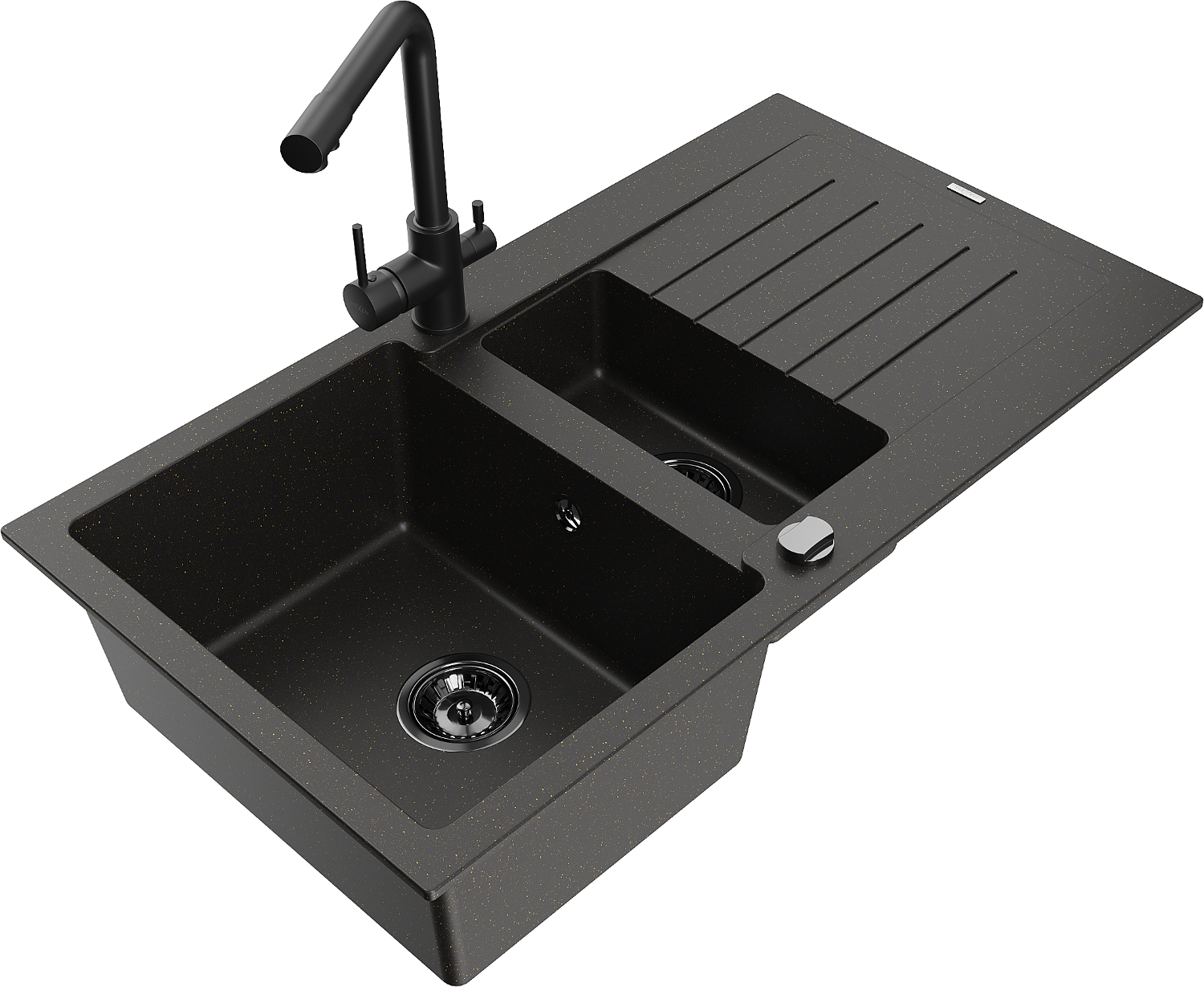 Mexen Matias granitinė 1,5 kamerų virtuvės kriauklė su nusausintuvu ir Duero maišytuvu, juoda/auksinė - 6502-75-671600-70-B