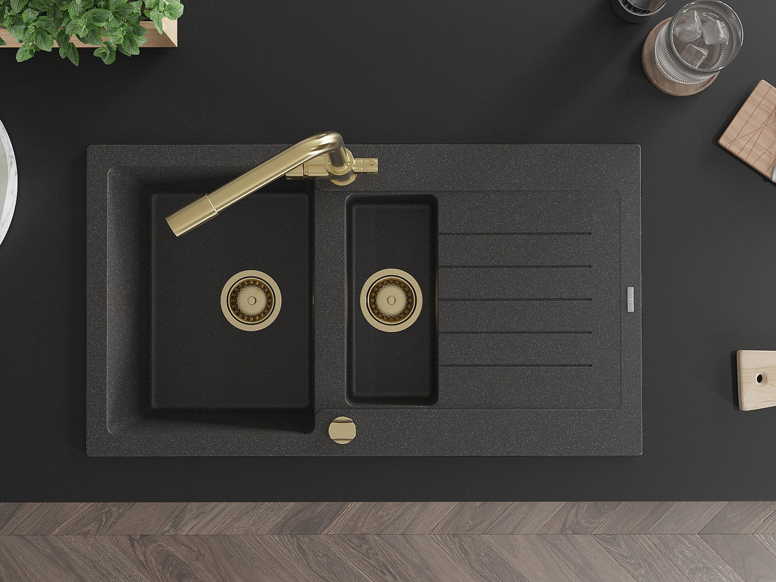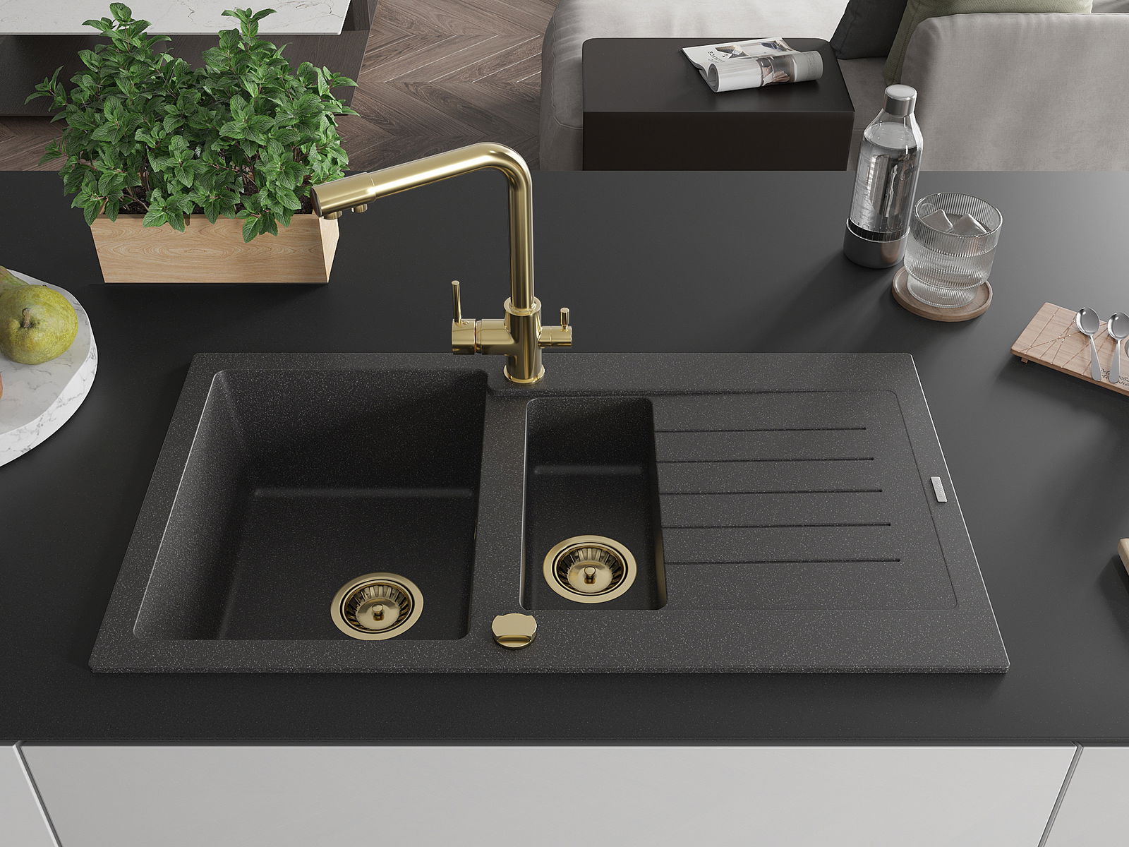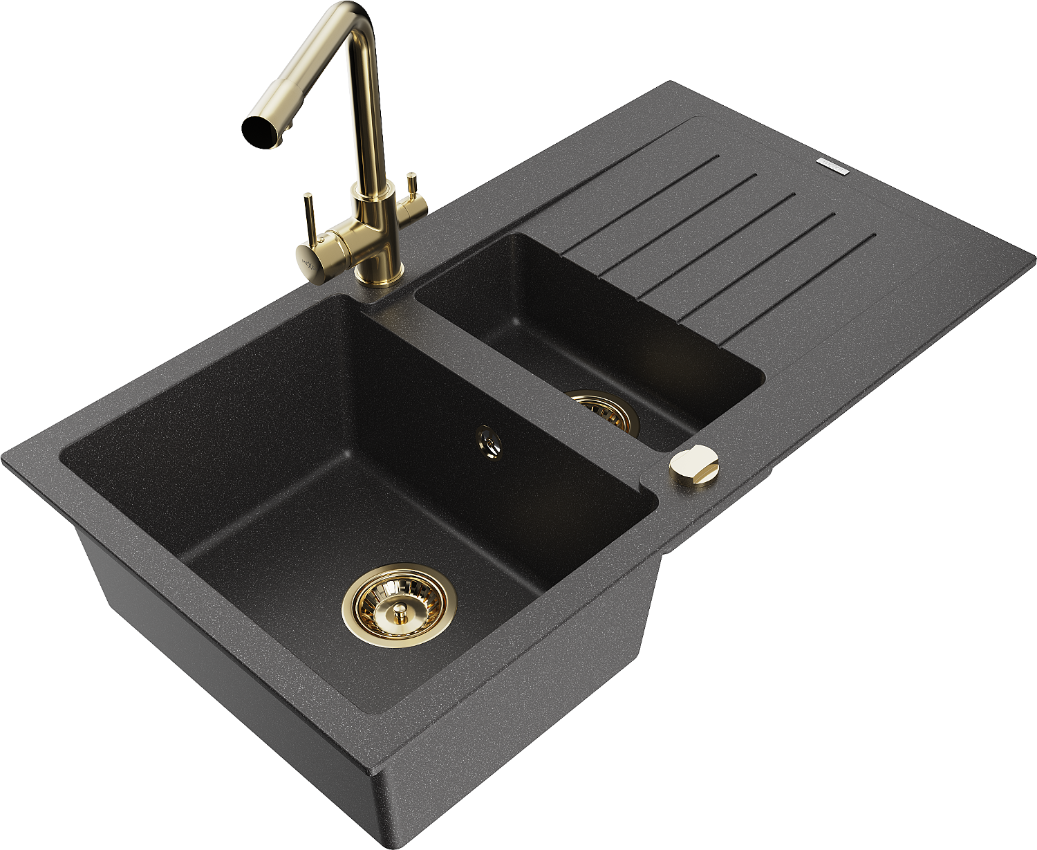 Mexen Matias granito kriauklė 1,5 skyrių su nuvarvėjimo vieta ir virtuvės maišytuvu Duero, juodas palietimu - 6502-76-671600-50