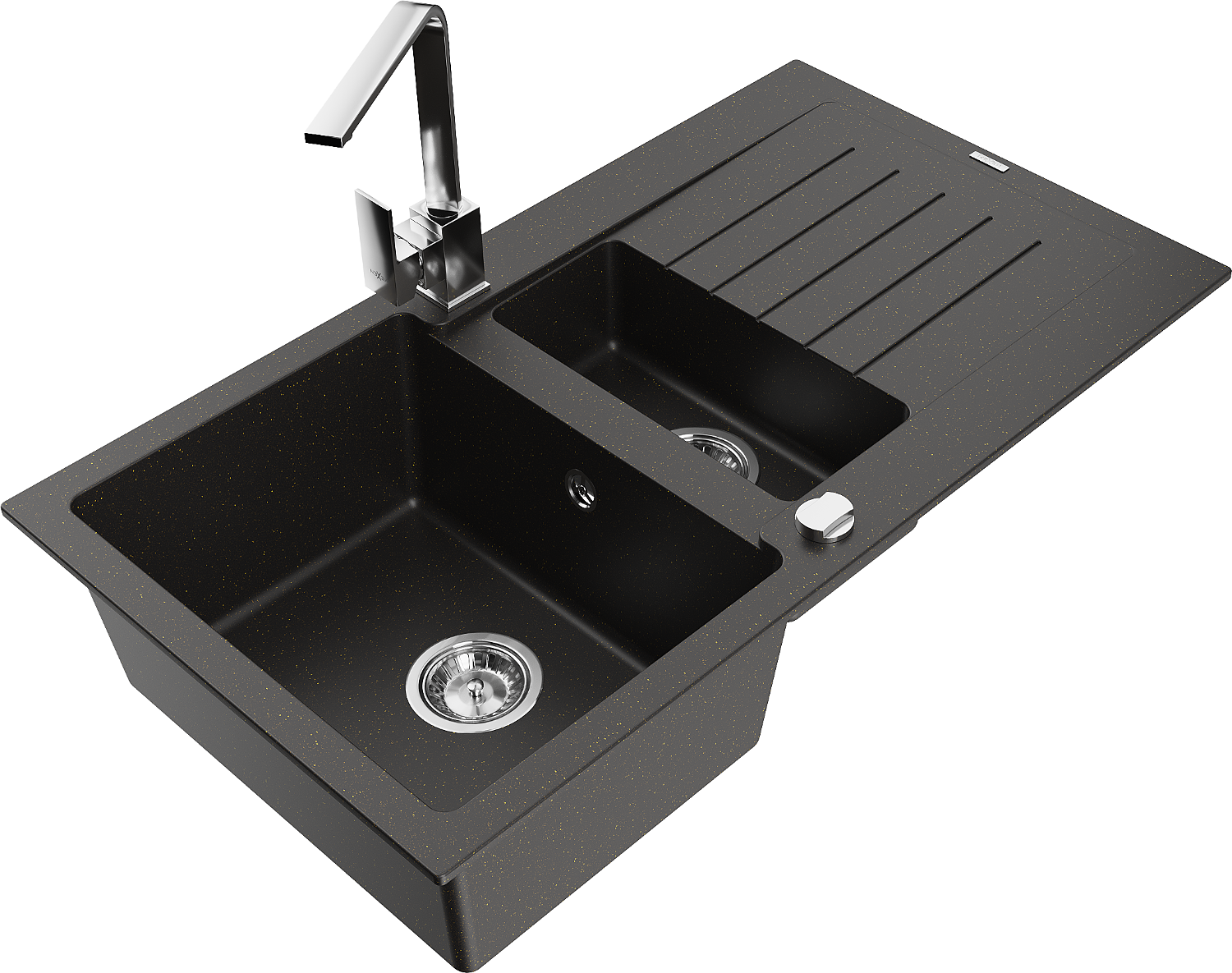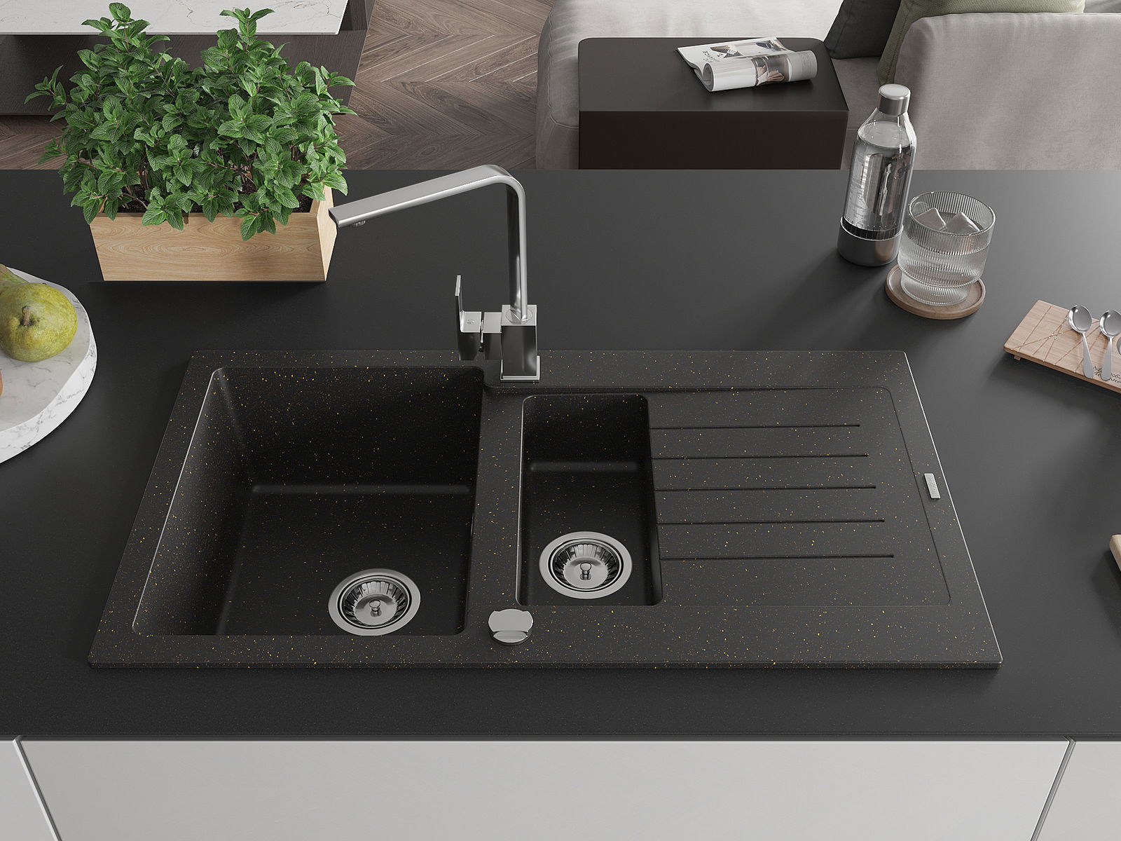 Mexen Matias granitinis plautuvas 1,5 skyrių su nuvarvėjimu ir virtuvės maišytuvu Rita, juodas/auksinis - 6502-75-670300-00