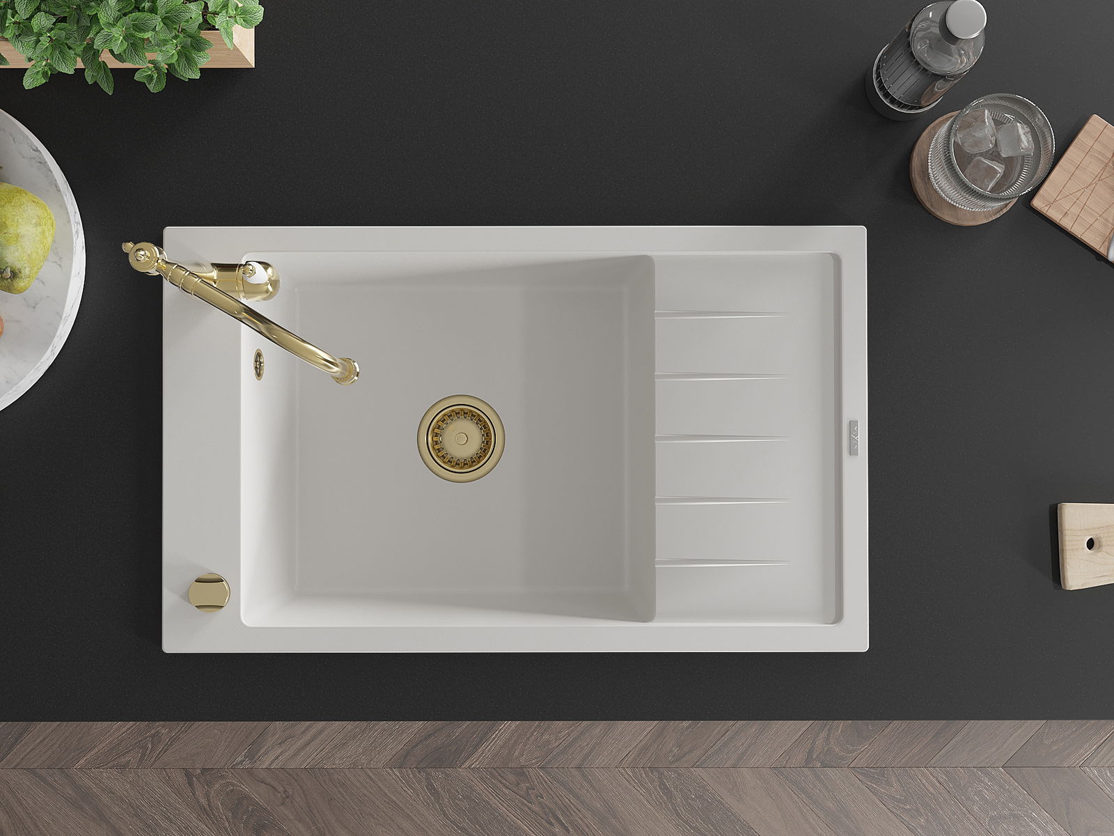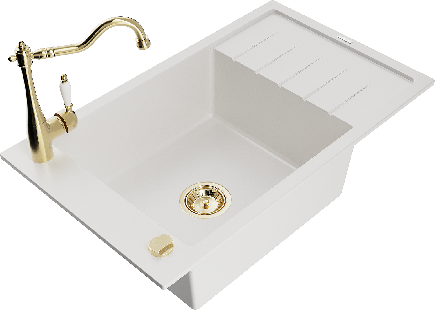 Mexen Elias vienos sekcijos granitinė plautuvė su nusausinimo zona ir virtuviniu maišytuvu Carla, balta - 6511-20-670700-50