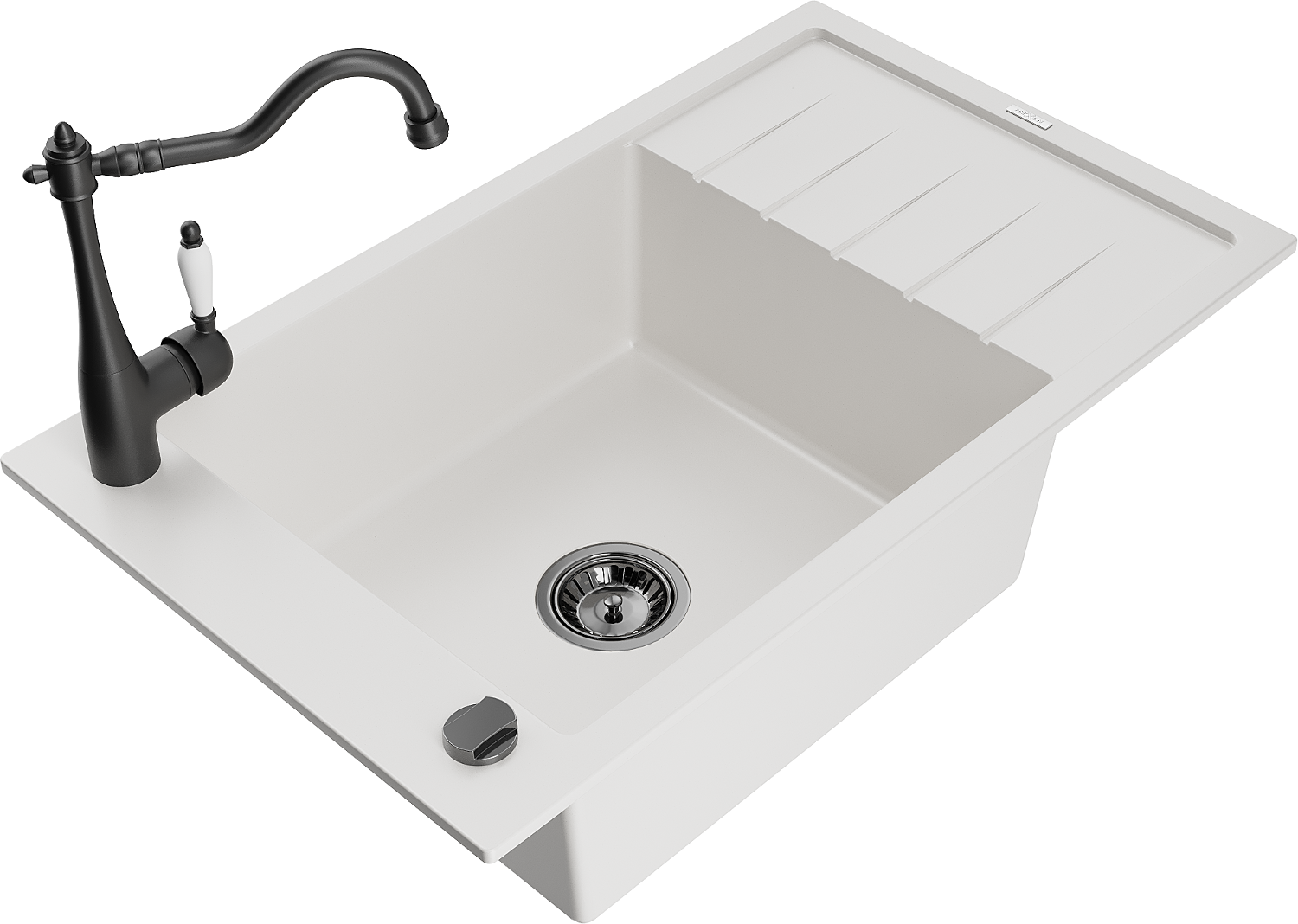 Mexen Elias granito plautuvė, 1 skyrius su drenažu ir virtuvės maišytuvu Carla, balta - 6511-20-670700-70