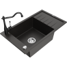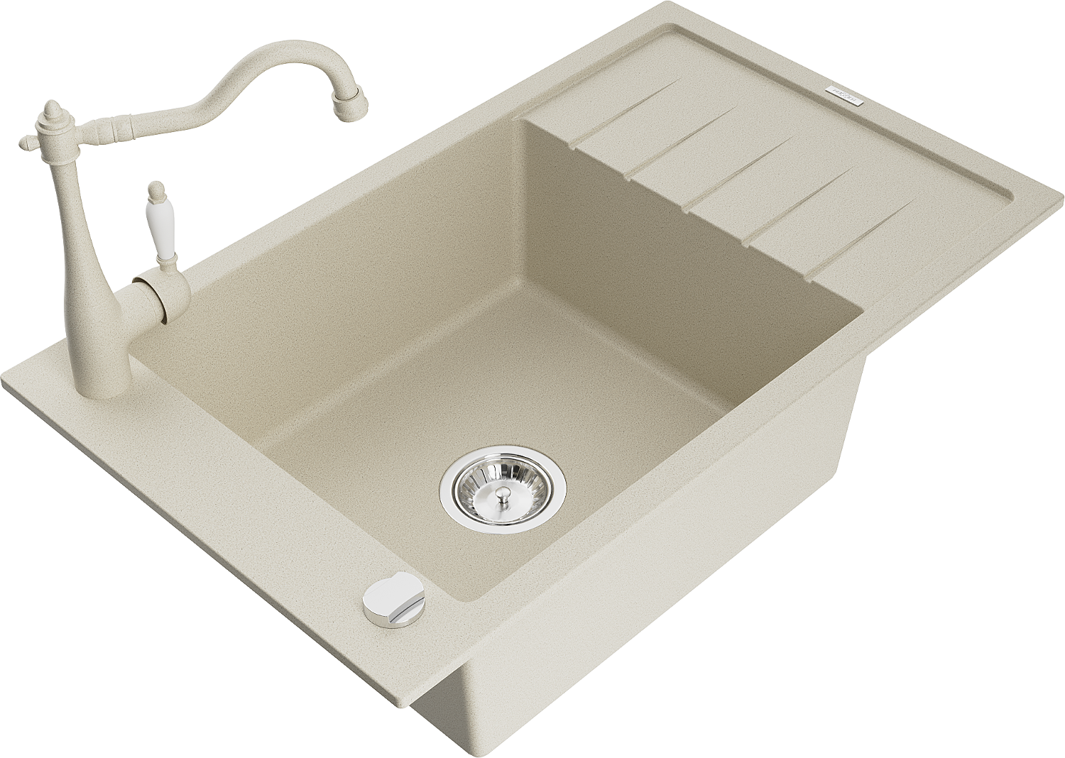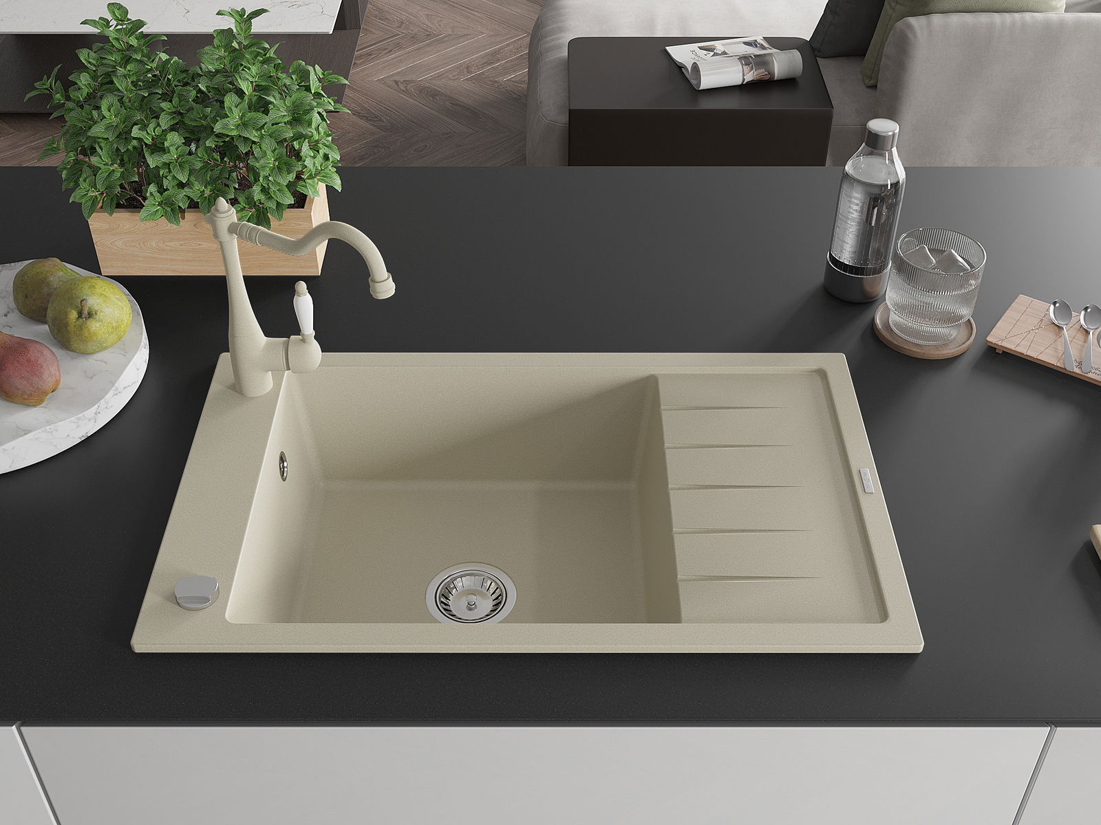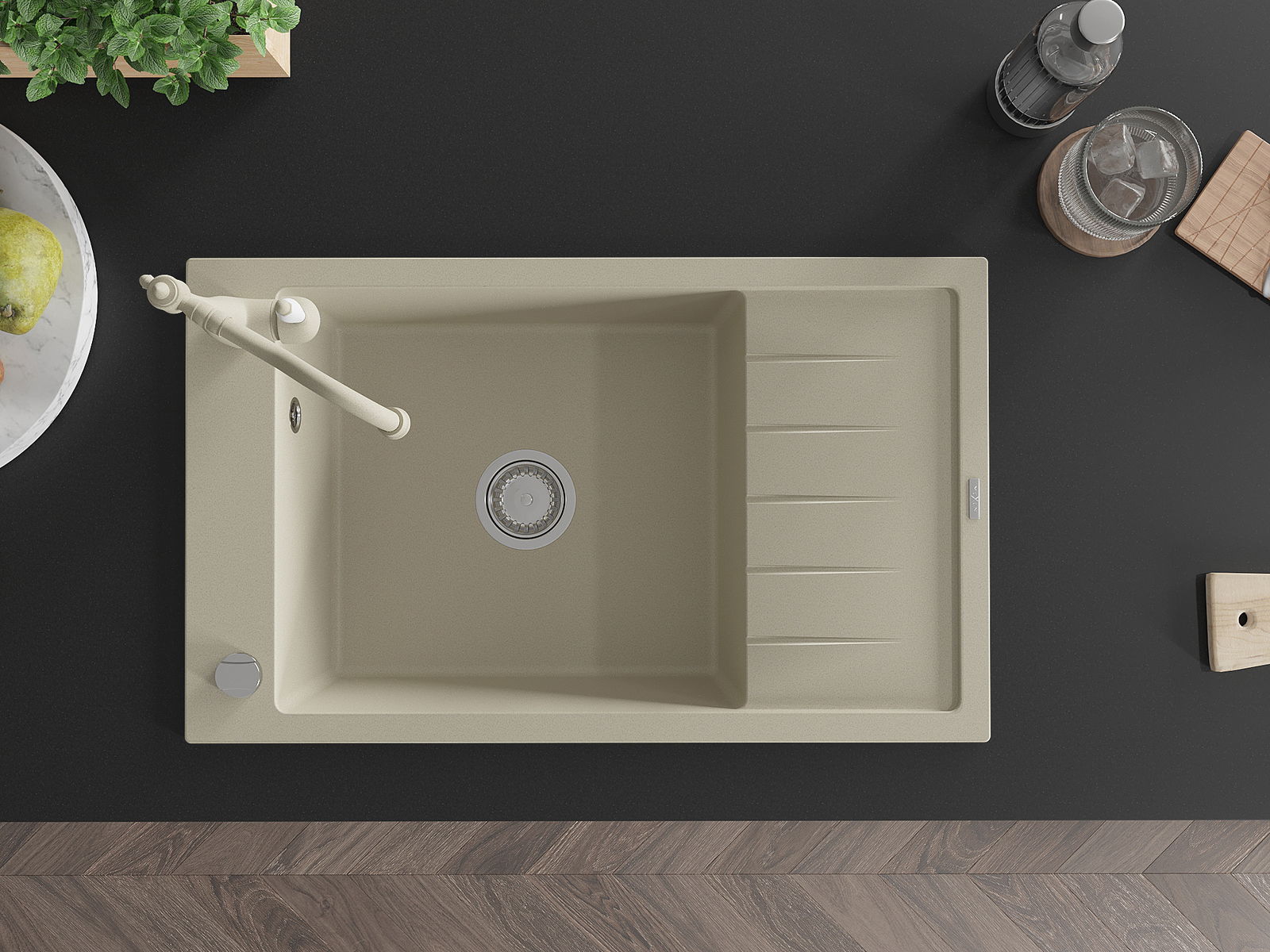 Mexen Elias granitinė vieno dubens plautuvė su nusausinimo lentynėle ir virtuviniu maišytuvu Carla, smėlio spalvos