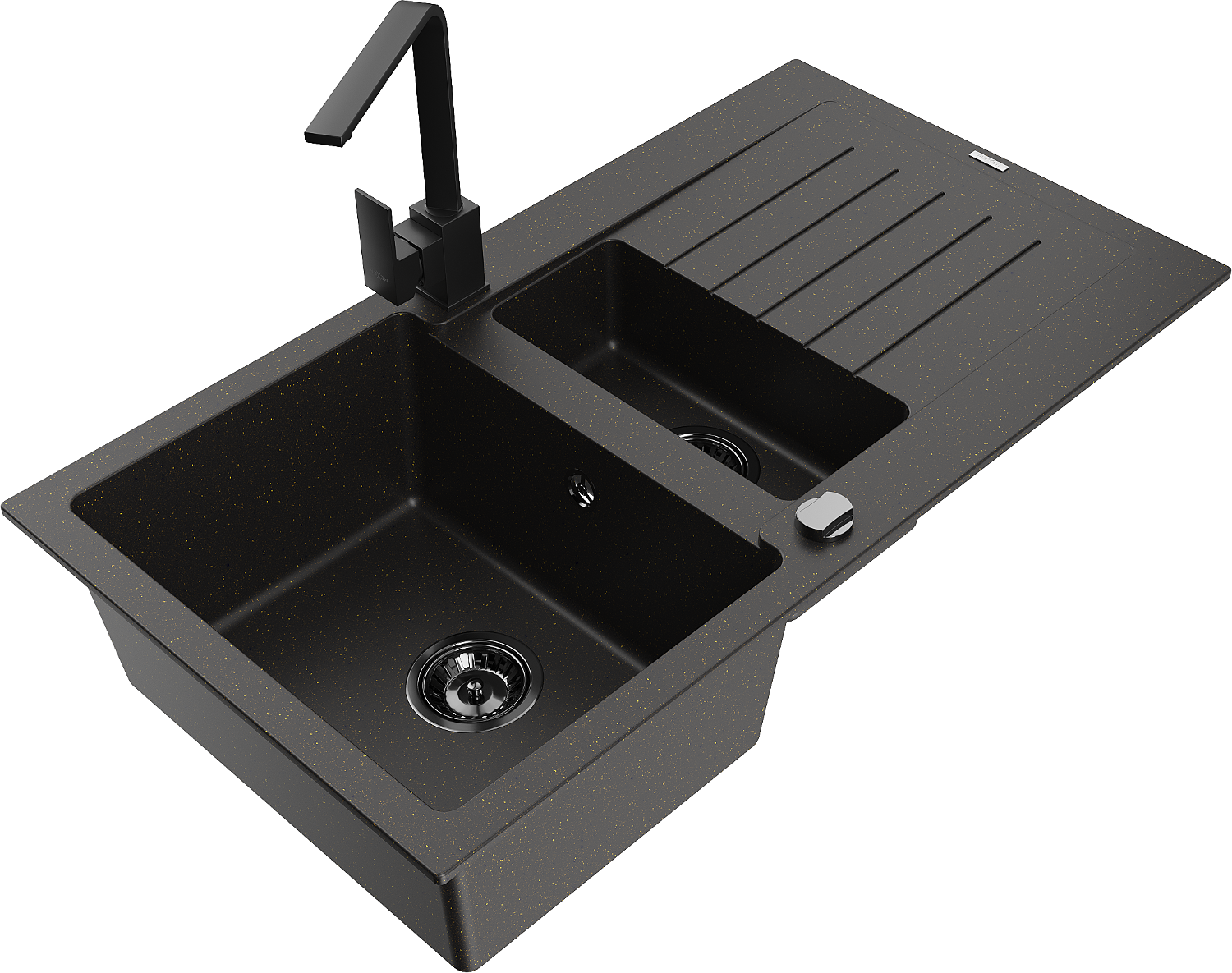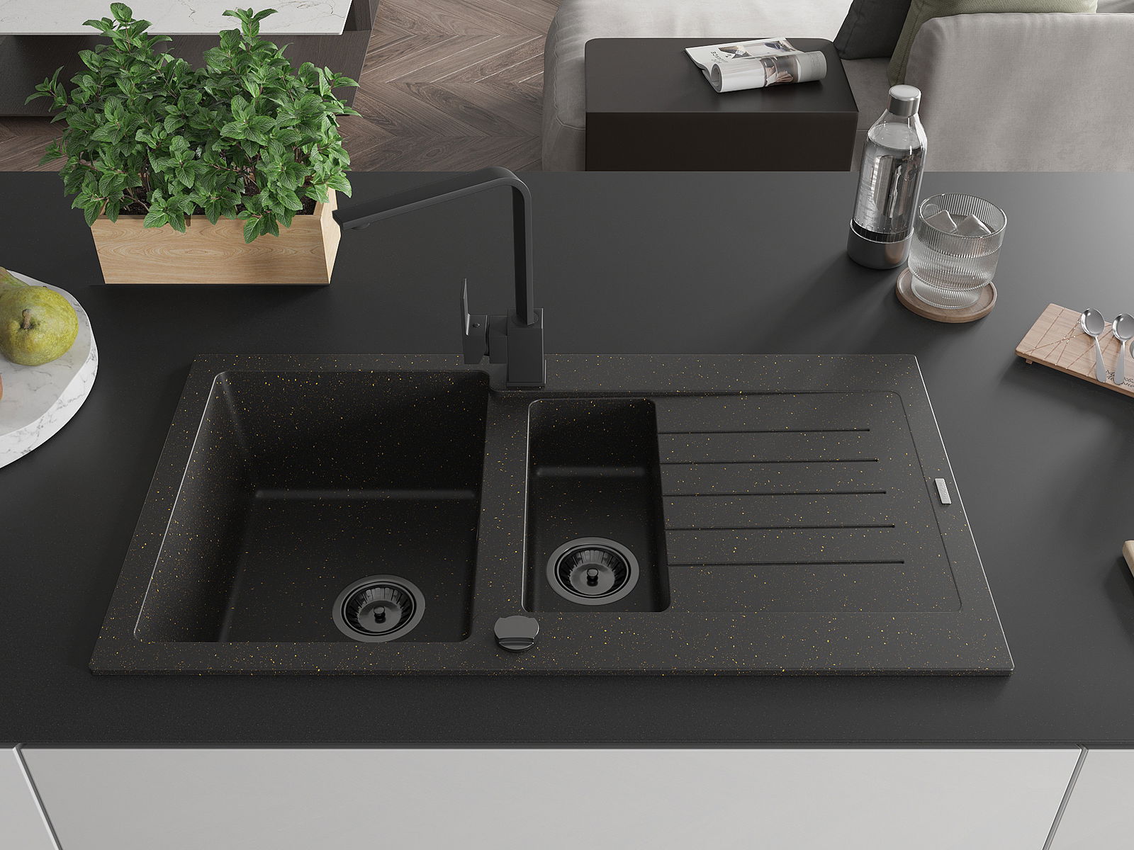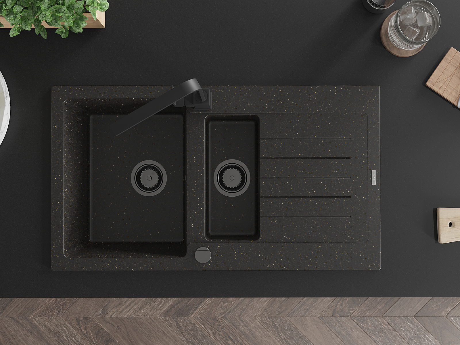 Mexen Matias granitinė 1,5 dubens plautuvė su drenažu ir virtuviniu maišytuvu Rita, juoda/auksinė - 6502-75-670300-70-B