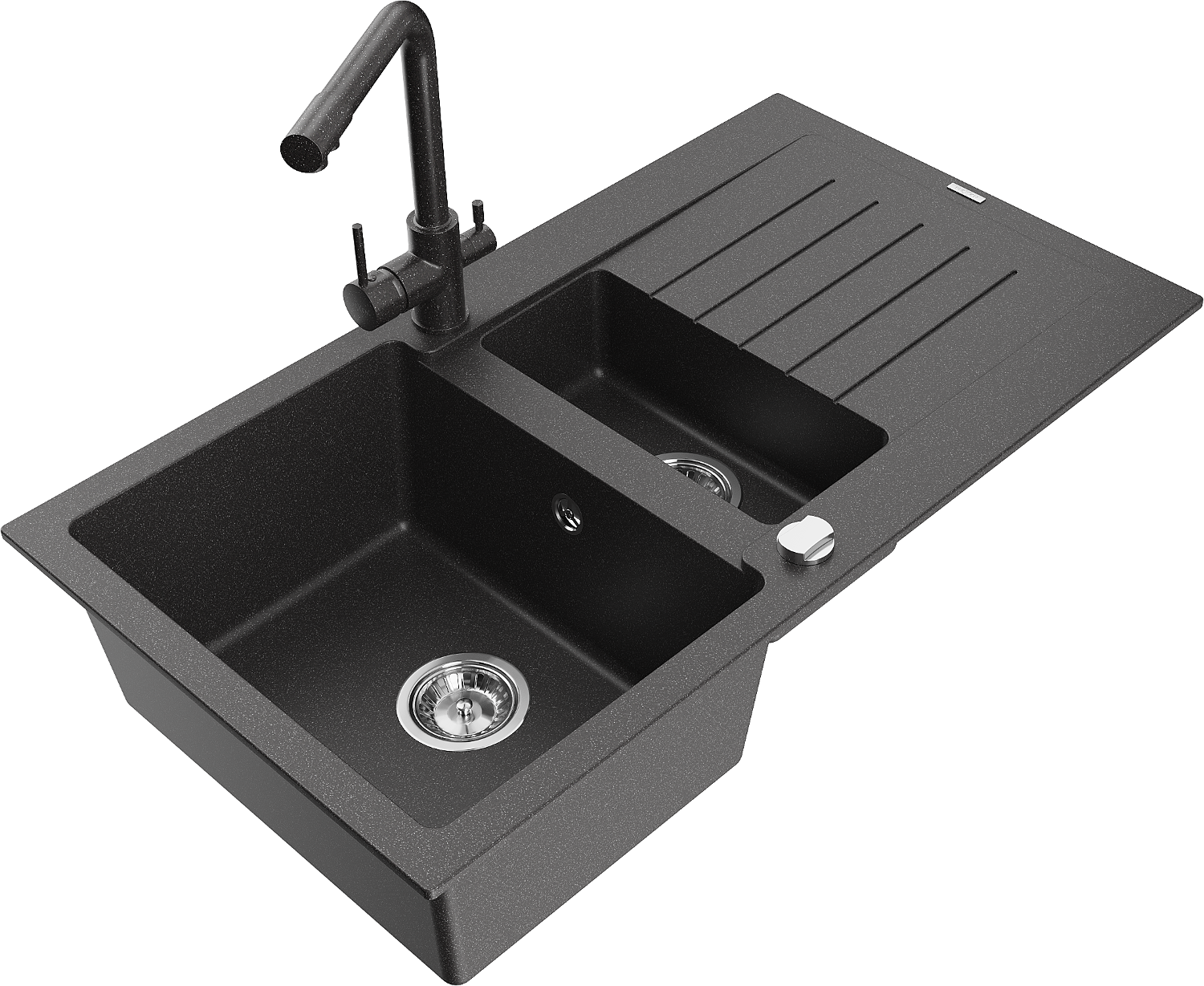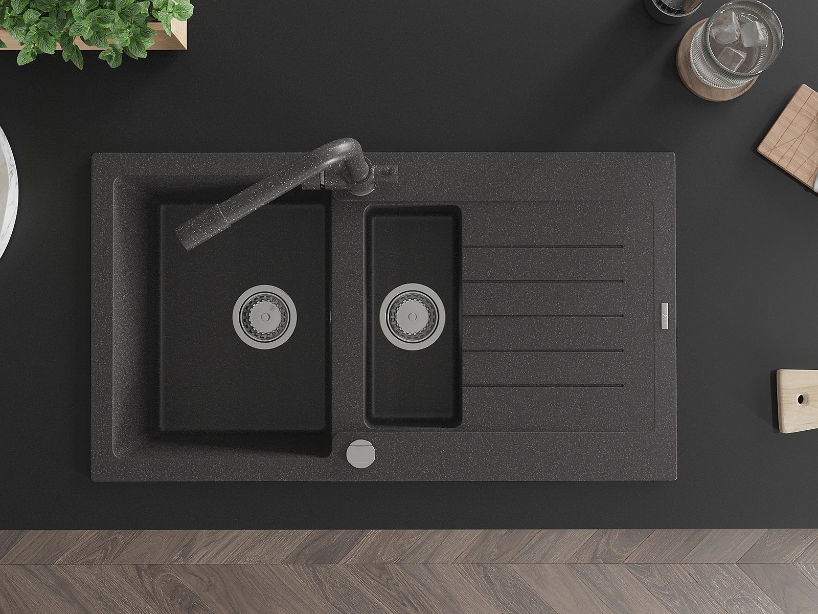 Mexen Matias granitinė 1,5 skylių plautuvė su nuvarvikliu ir virtuvės maišytuvu Duero, juoda su taškučiais