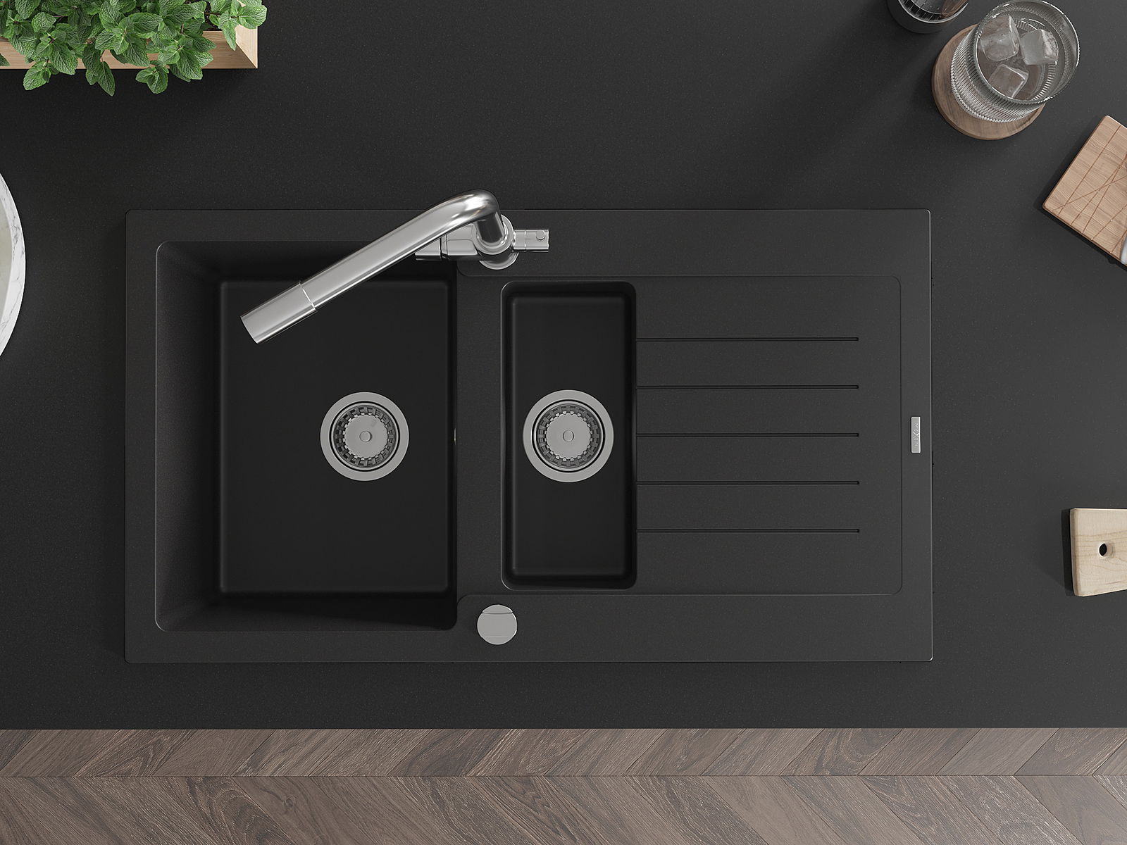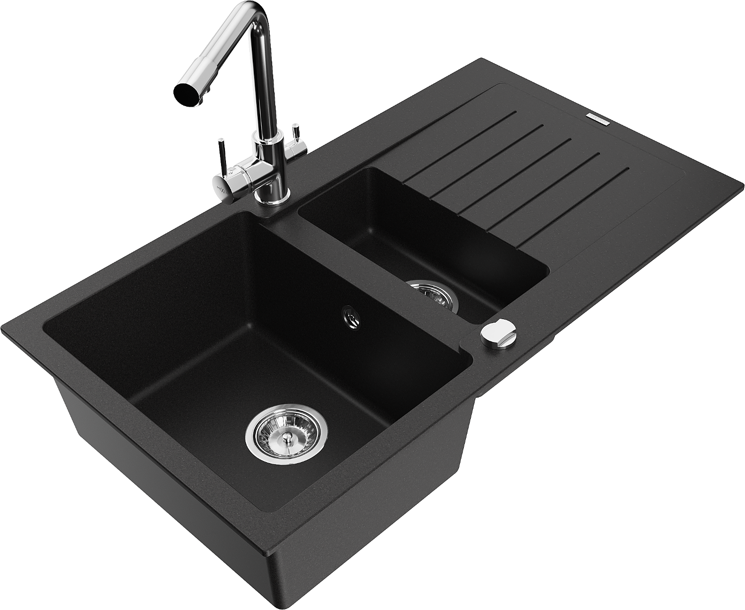 Mexen Matias granito kriauklė 1,5 skylių su lašintuvu ir virtuviniu maišytuvu Duero, juoda - 6502-77-671600-00