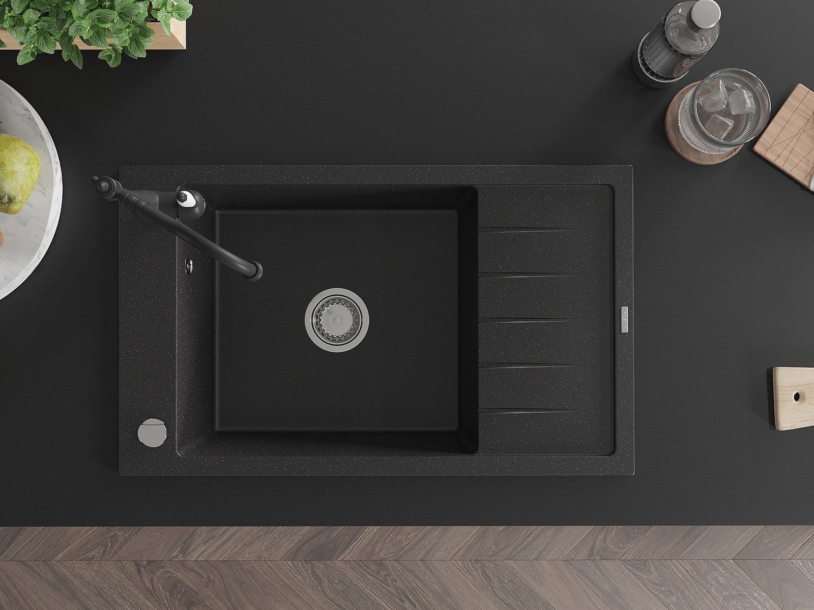 Mexen Elias granito plautuvė su viena kamera ir nusausinimo lentele bei virtuves maišytuvu Carla, juoda/sidabrinė metalika - 65?