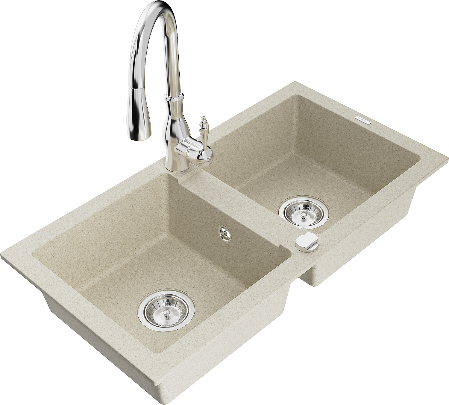 Mexen Mario granito dviejų skylių plautuvė su virtuviniu maišytuvu Savita, smėlio - 6504-69-672601-00