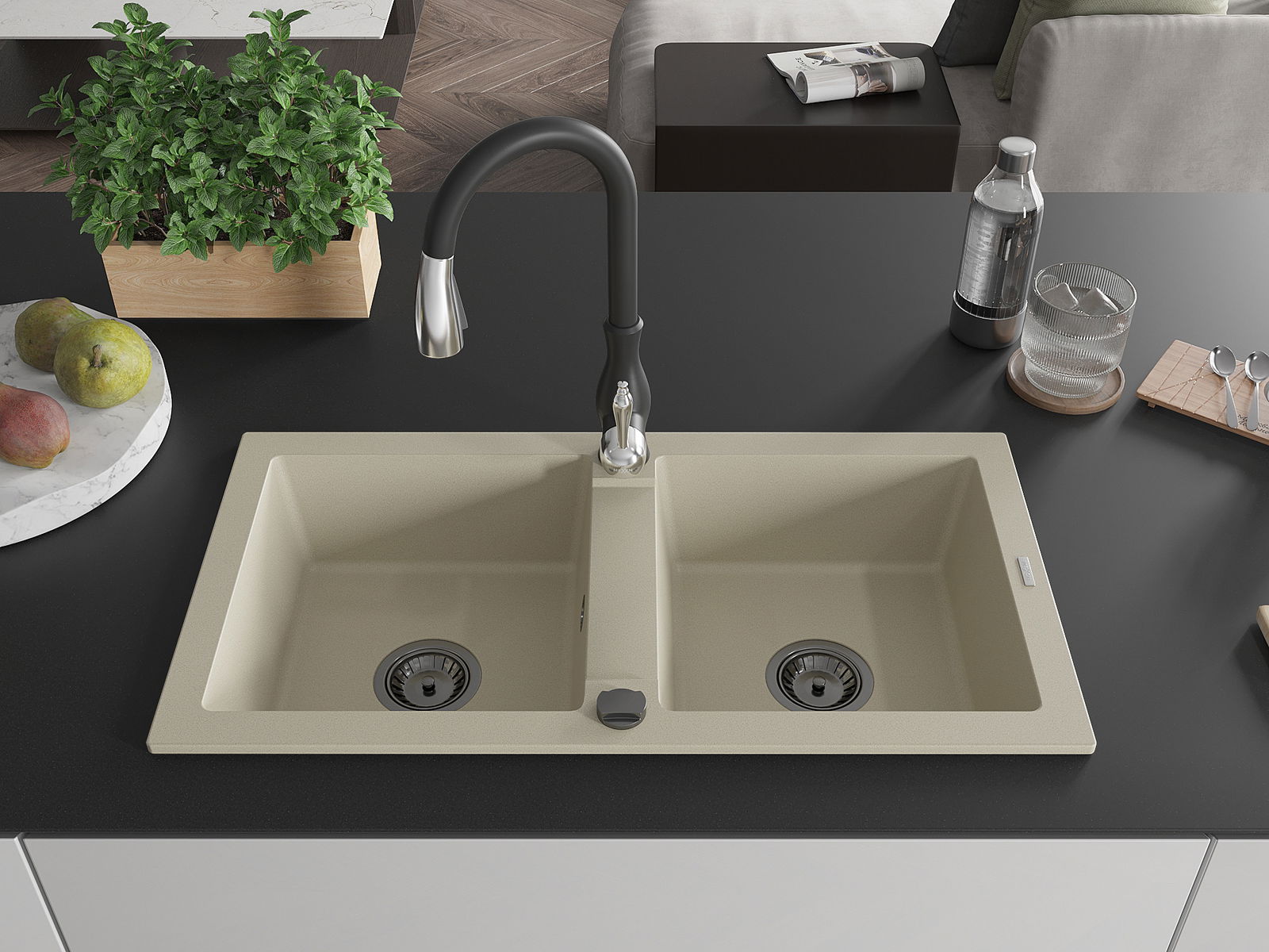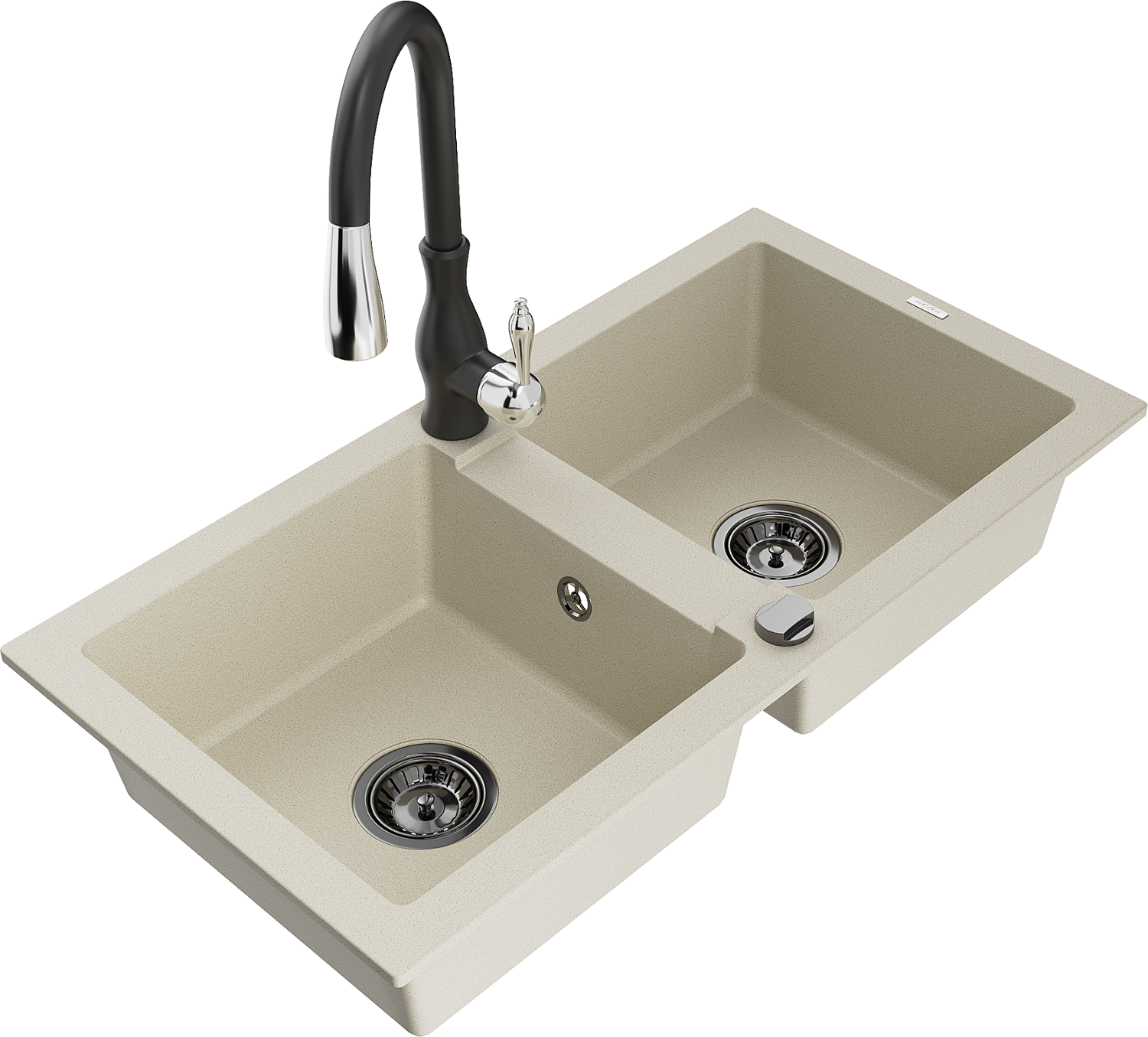 Mexen Mario granitinis dviejų skyrių plautuvas su virtuviniu maišytuvu Savita, smėlio spalvos - 6504-69-672601-70