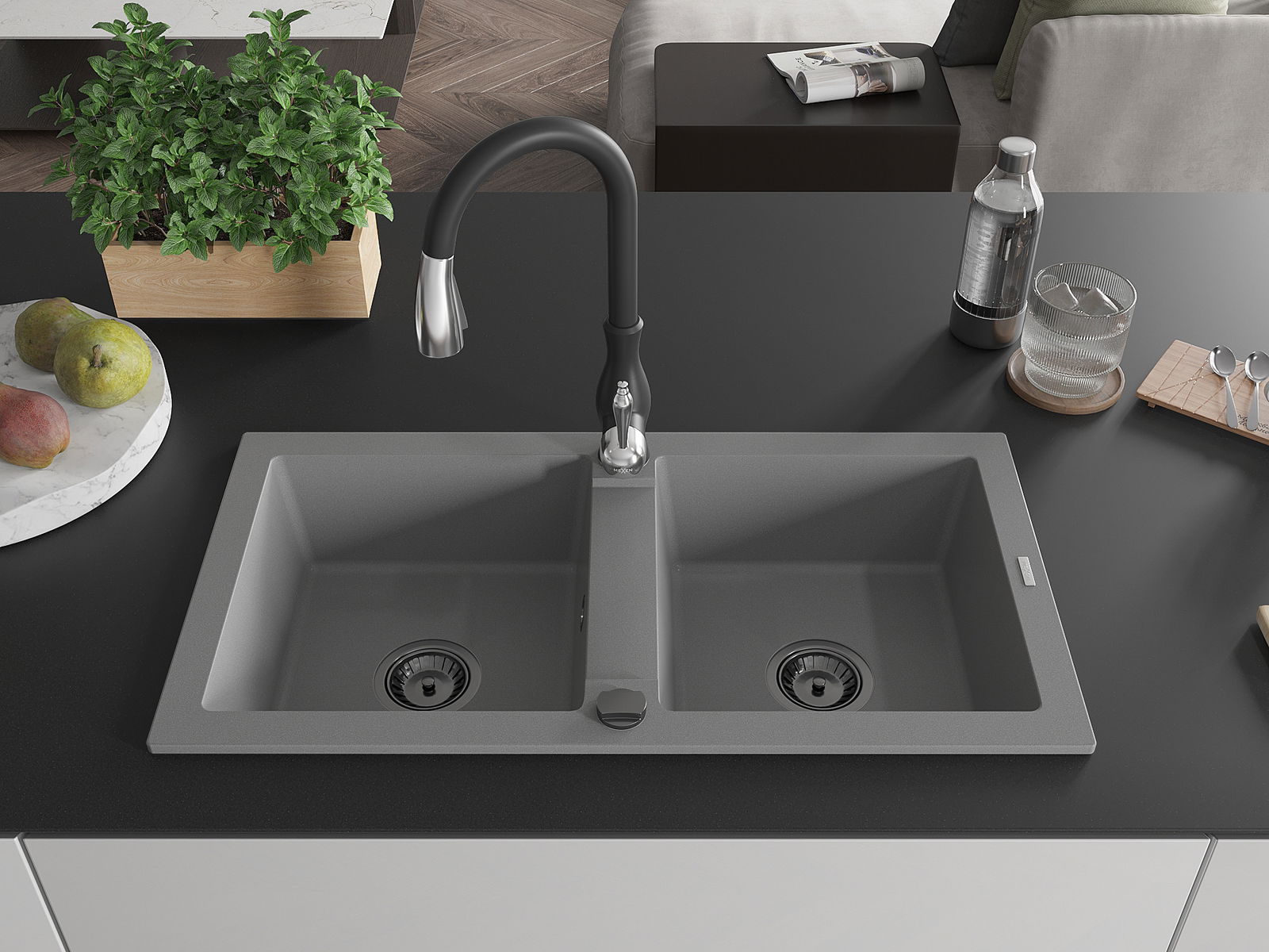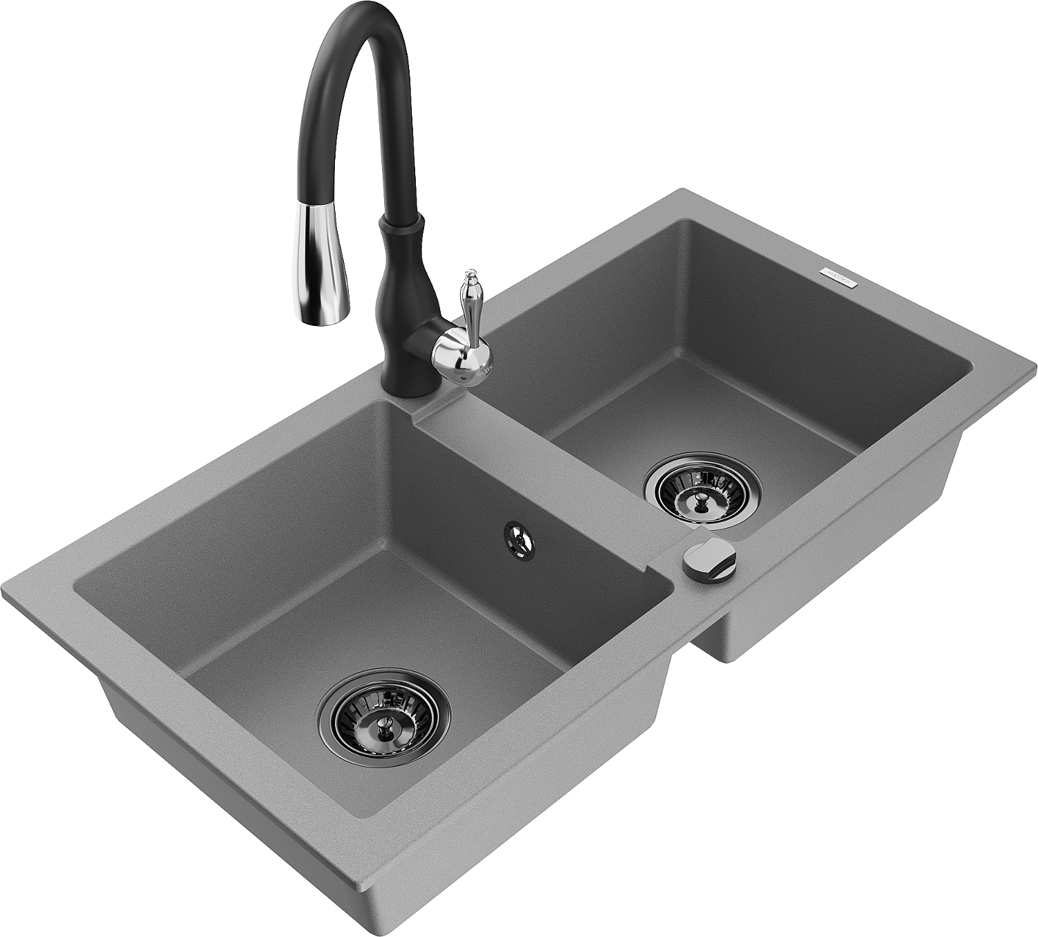 Mexen Mario granito kriauklė su 2 skyreliais ir virtuviniu maišytuvu Savita, pilka - 6504-71-672601-70-B